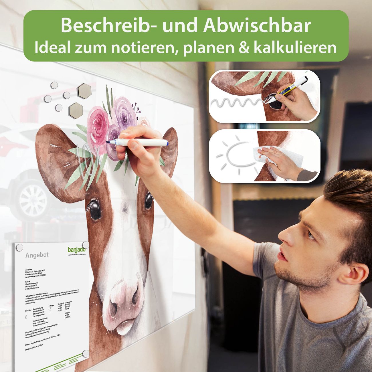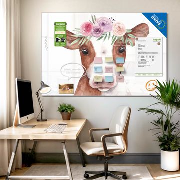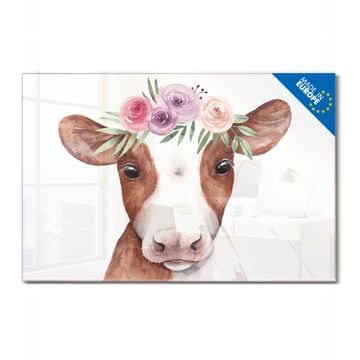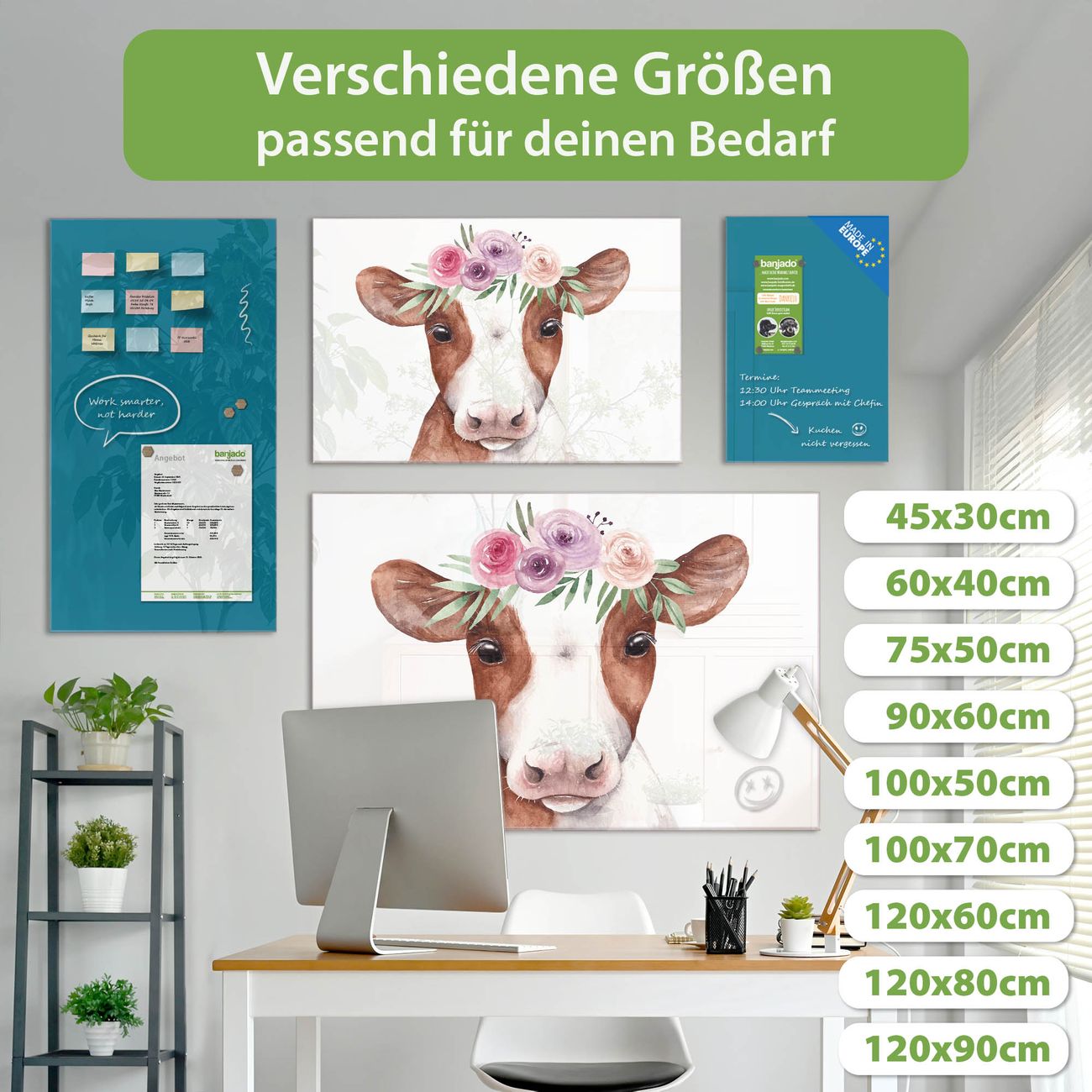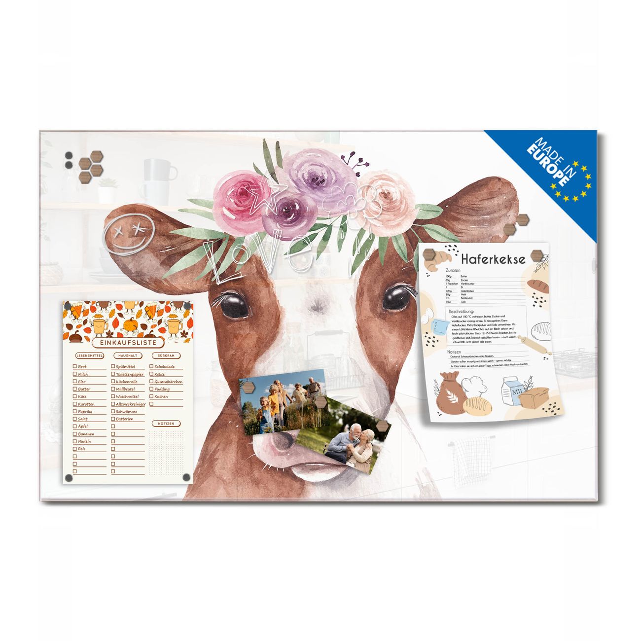 Material: 4mm Sicherheitsglas mit Metallrückwand Eigenschaften: beschreibbar, magnetisch, kratzfest Maße: 75x50x0,6cm, 5,63kg schwer Motiv Nummer 13453 Blumenkronen-Kuh Zubehör: inklusive 4 Neodym-Magnete