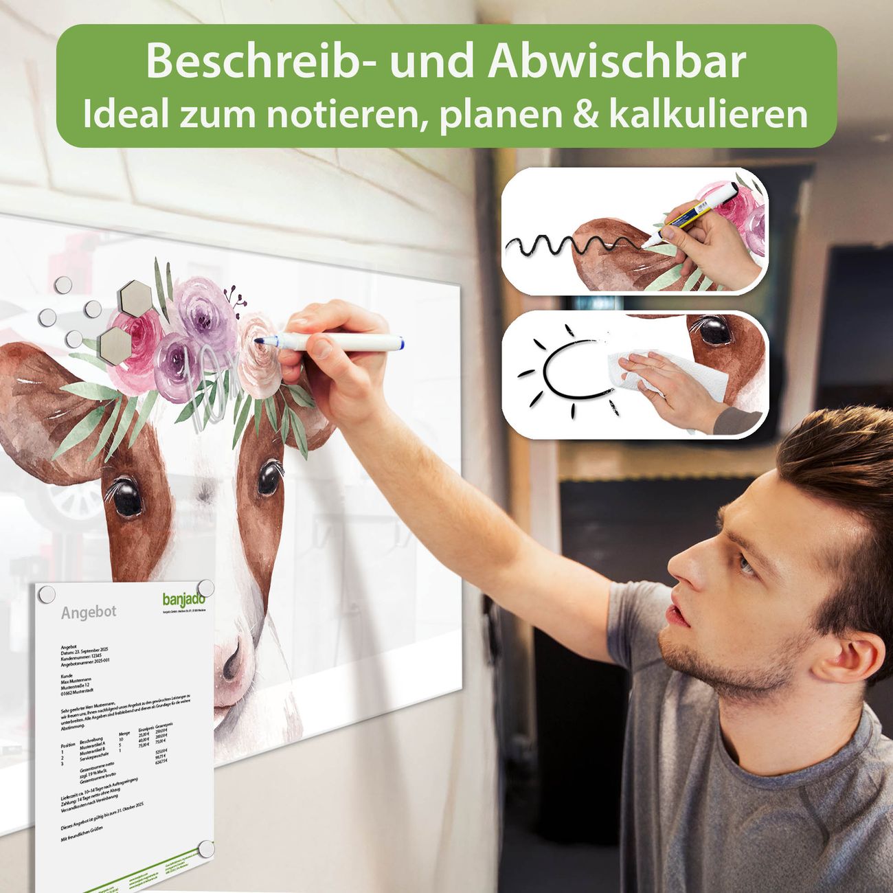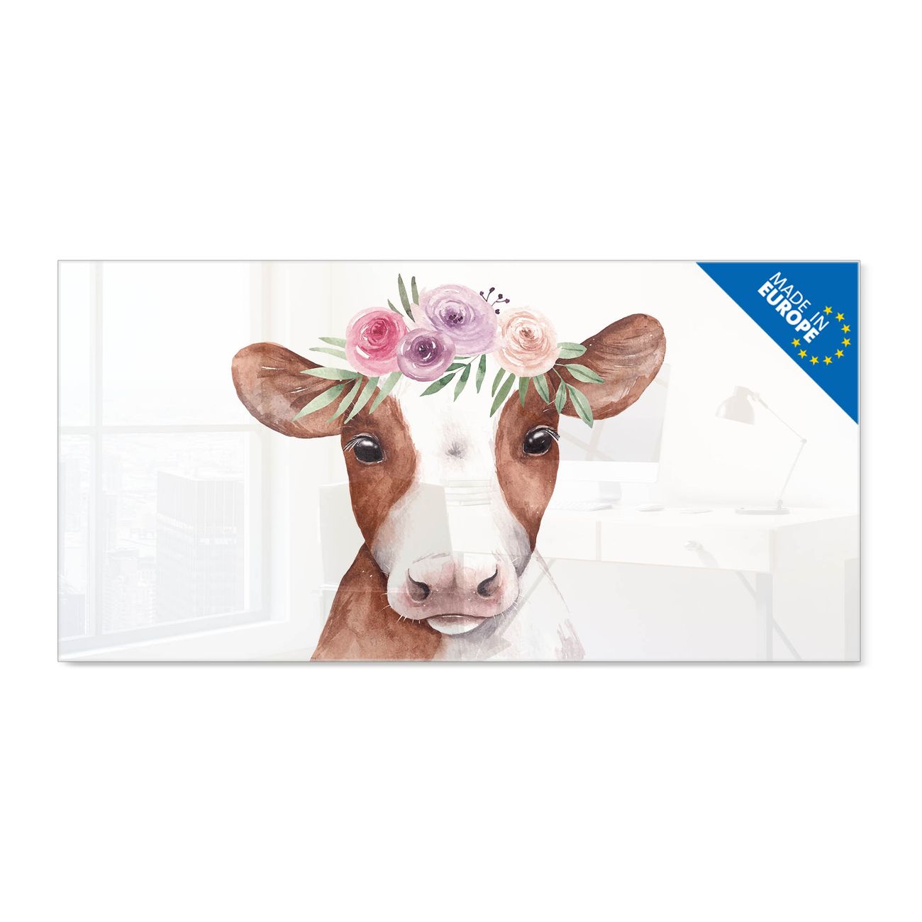 Material: 4mm Sicherheitsglas mit Metallrückwand Eigenschaften: beschreibbar, magnetisch, kratzfest Maße: 100x50x0,6cm, 7,50kg schwer Motiv Nummer 13453 Blumenkronen-Kuh Zubehör: inklusive 4 Neodym-Magnete