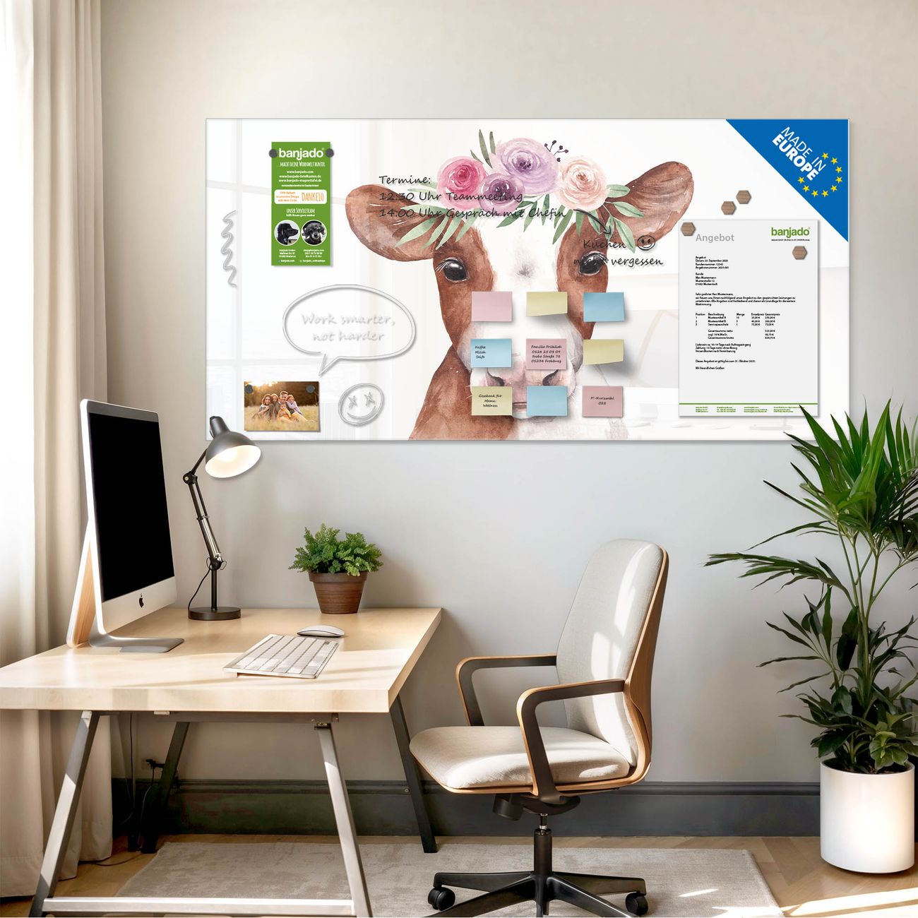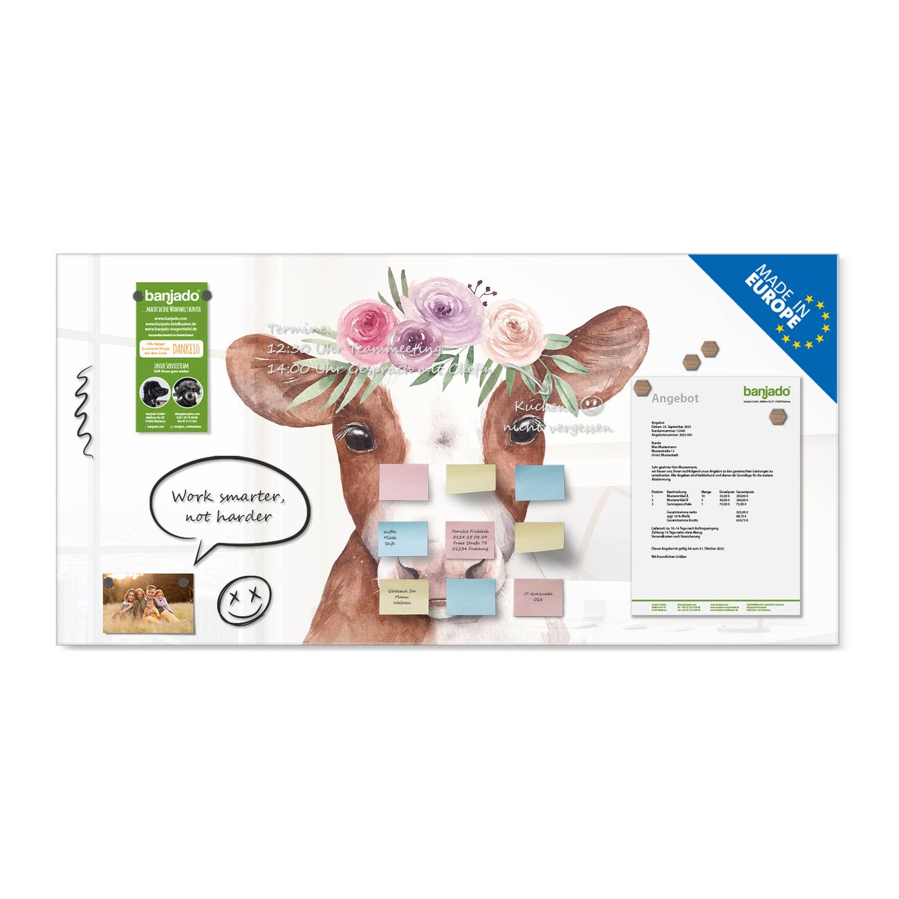 Die banjado Glas Magnettafel mit dem Motiv Motiv Blumenkronen-Kuh verbindet Funktionalität mit Stil. Sie ersetzt das Zettelchaos durch klare Strukturen und bringt dabei eine warme, natürliche Atmosphäre in Ihr Zuhause. Ob im Büro, in der Küche oder im Eingangsbereich - dieses Design-Board zieht Blicke an und sorgt für Ordnung mit Charakter.
