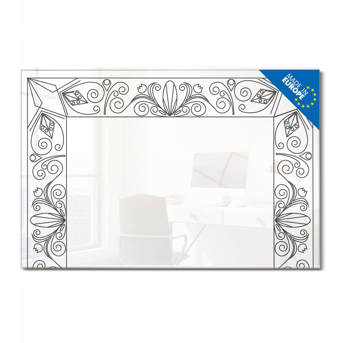 Material: 4mm Sicherheitsglas mit Metallrückwand Eigenschaften: beschreibbar, magnetisch, kratzfest Maße: 120x80x0,6cm, 14,40kg schwer Motiv Nummer 13574 Blumenornament-Rahmen Zubehör: inklusive 4 Neodym-Magnete