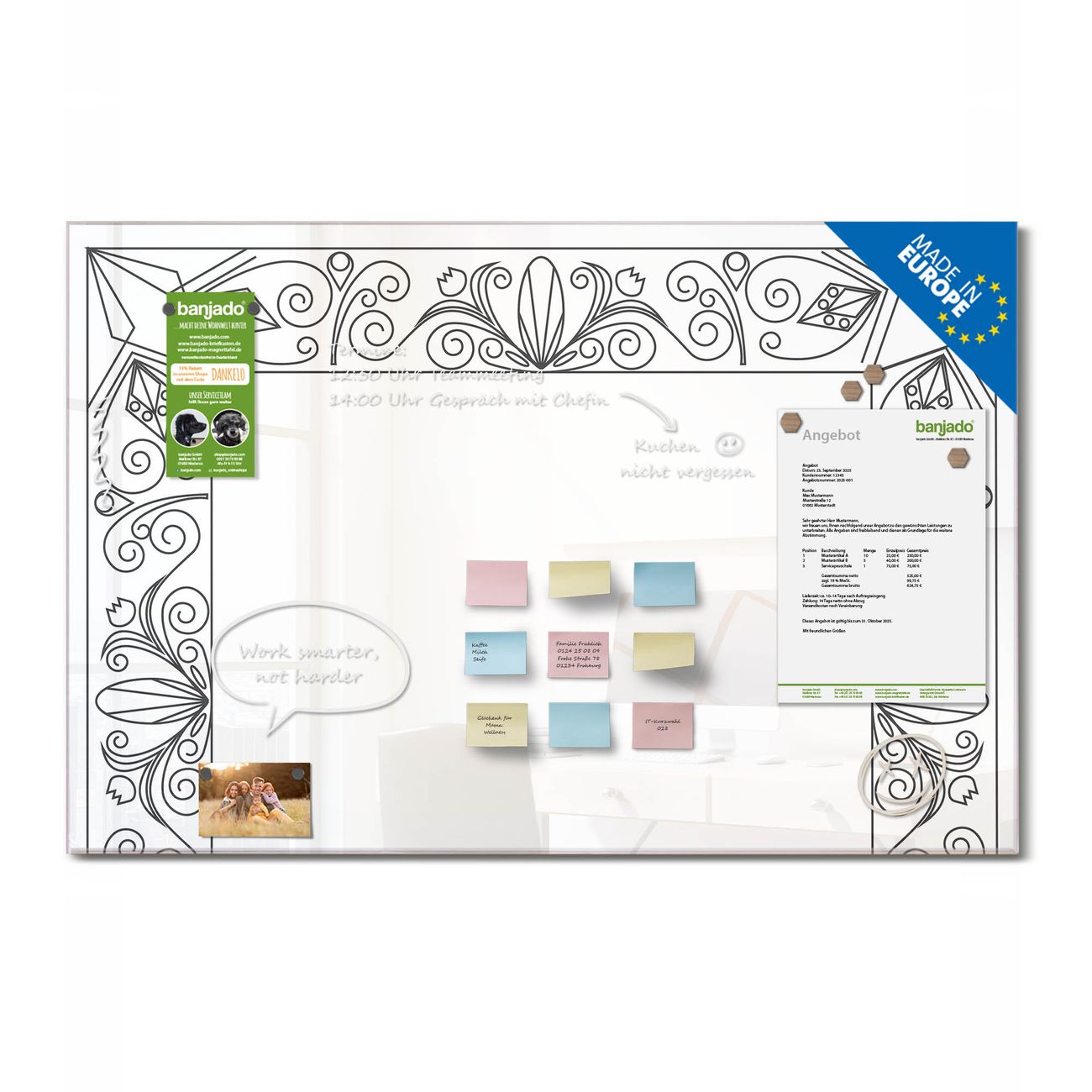 Ein Stück Design, das Ihren Alltag organisiert. Schreiben, heften, inspirieren - alles an einem Ort. Qualität, die man spürt. Montage leicht gemacht. Handwerk mit Herz - veredelt in Sachsen. Einzigartiges Design mit Motiv Motiv Blumenornament-Rahmen Beschreibbare Glasoberfläche, leicht zu reinigen Starke Magnetkraft durch Stahlrückwand Inklusive 4 Neodym-Magneten Flexible Montageoptionen Handveredelt in Sachsen - Qualität, die bleibt