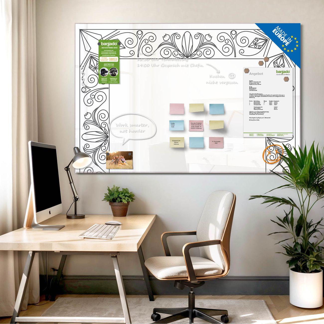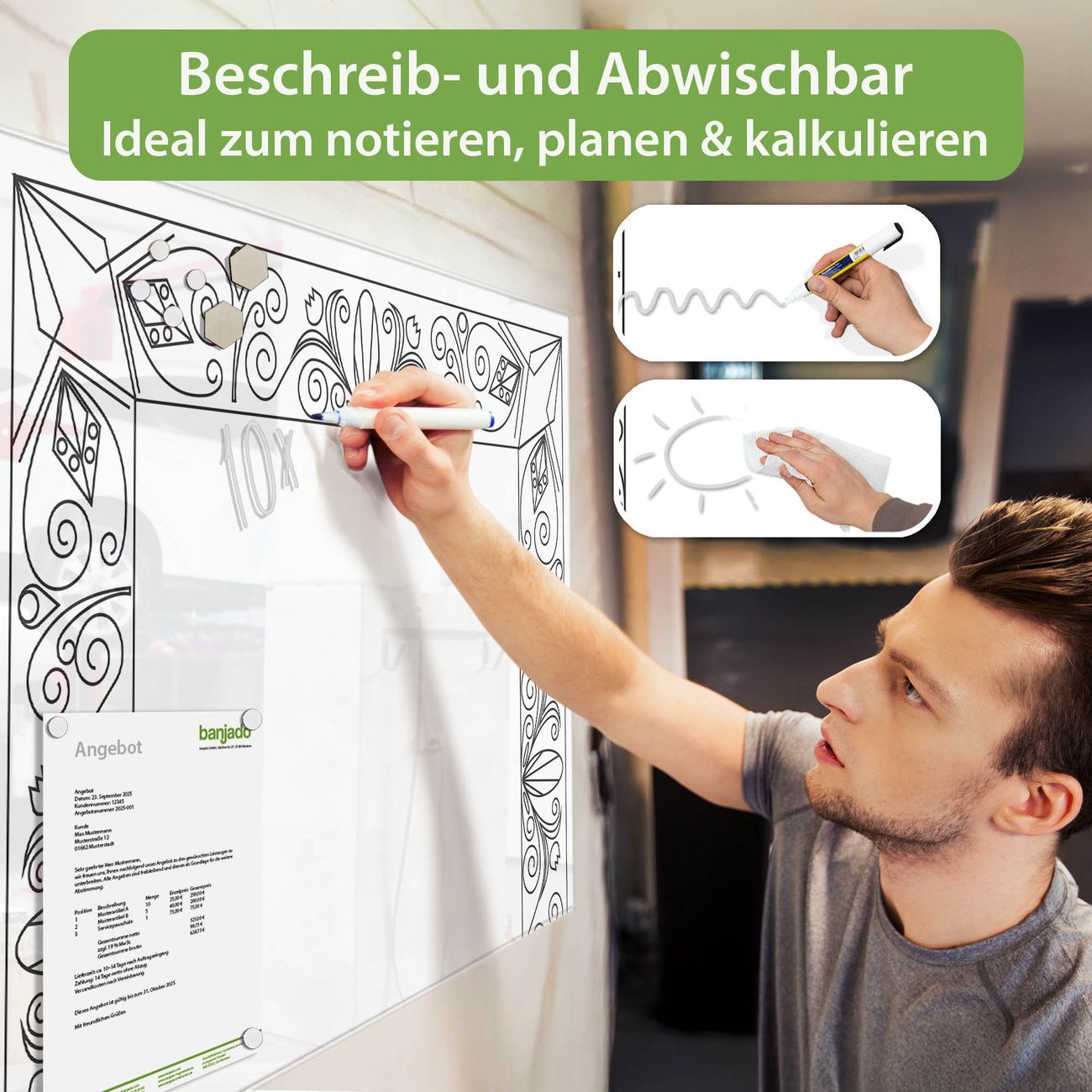 Jede Glas Magnettafel wird in unserer Werkstatt von Hand gefertigt und sorgfältig geprüft. So erhalten Sie ein echtes Qualitätsprodukt, das Funktion und Ästhetik perfekt vereint.?? Warum banjado?