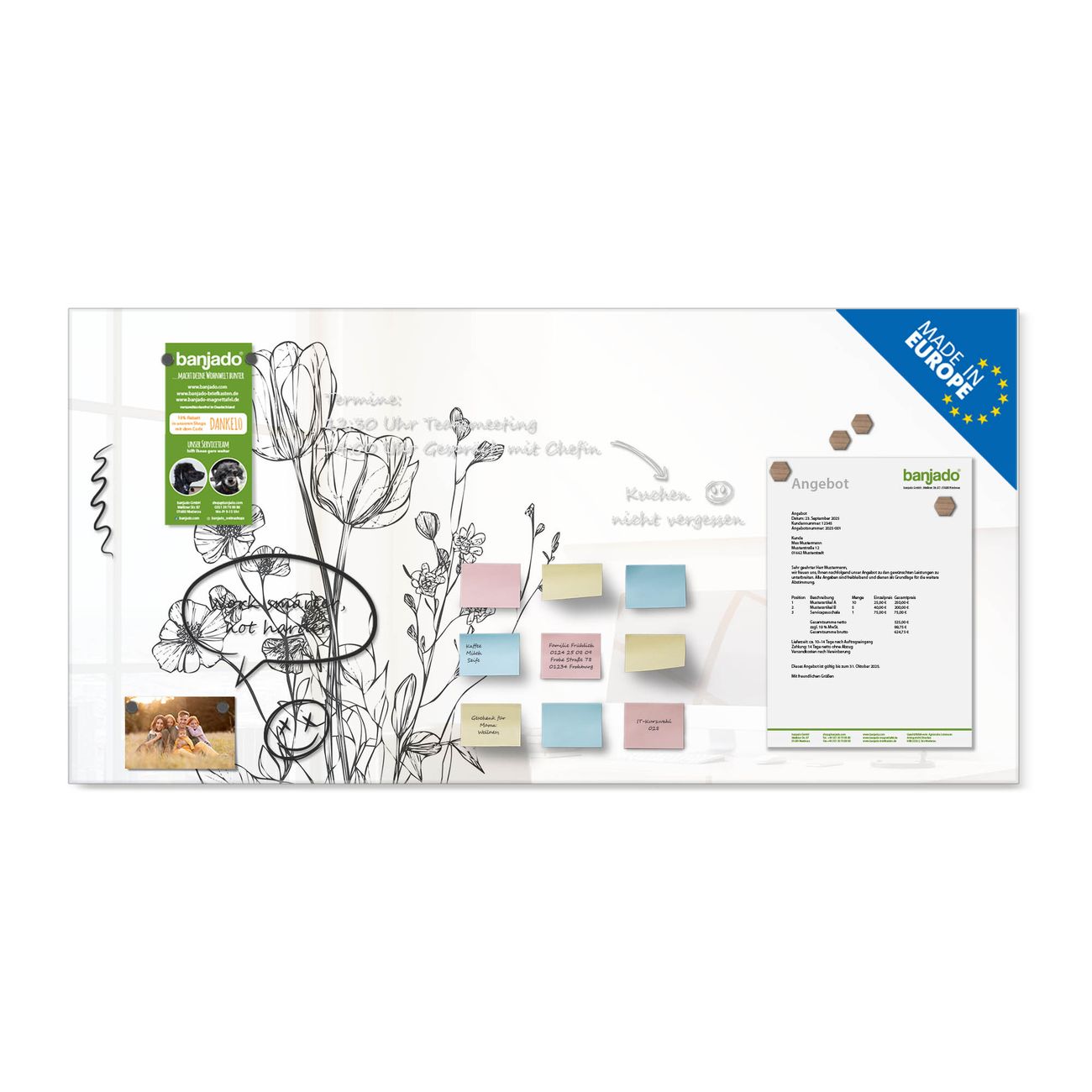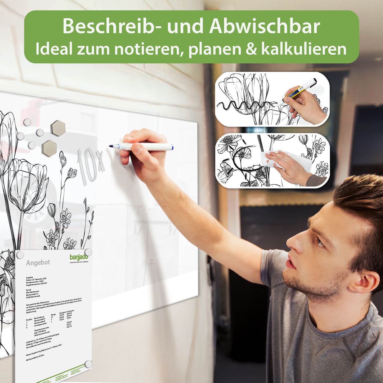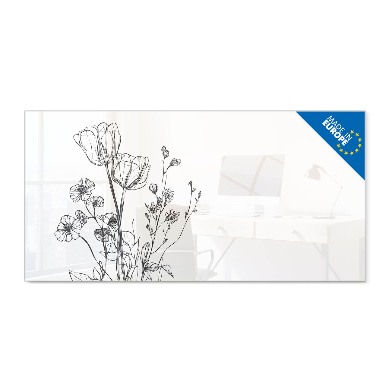 Material: 4mm Sicherheitsglas mit Metallrückwand Eigenschaften: beschreibbar, magnetisch, kratzfest Maße: 100x50x0,6cm, 7,50kg schwer Motiv Nummer 13226 Blumenskizze Zubehör: inklusive 4 Neodym-Magnete