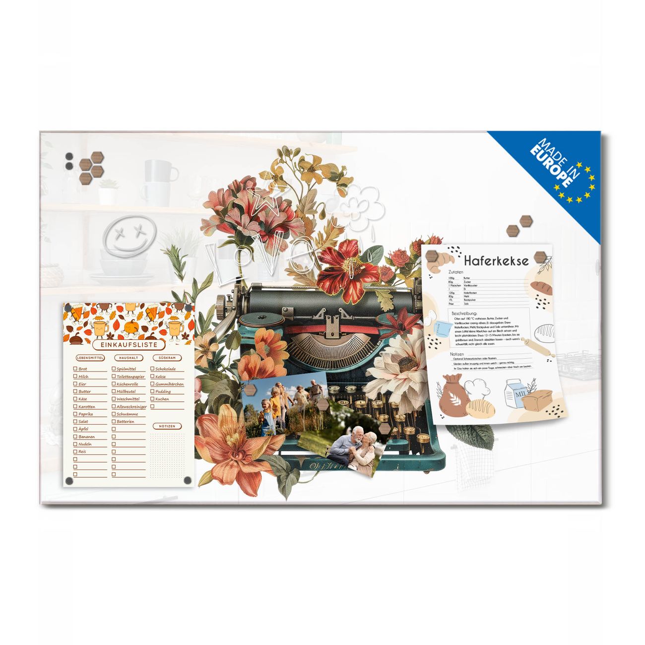 Ein Stück Design, das Ihren Alltag organisiert. Schreiben, heften, inspirieren - alles an einem Ort. Qualität, die man spürt. Montage leicht gemacht. Handwerk mit Herz - veredelt in Sachsen. Einzigartiges Design mit Motiv Motiv Blumige Schreibmaschine Beschreibbare Glasoberfläche, leicht zu reinigen Starke Magnetkraft durch Stahlrückwand Inklusive 4 Neodym-Magneten Flexible Montageoptionen Handveredelt in Sachsen - Qualität, die bleibt