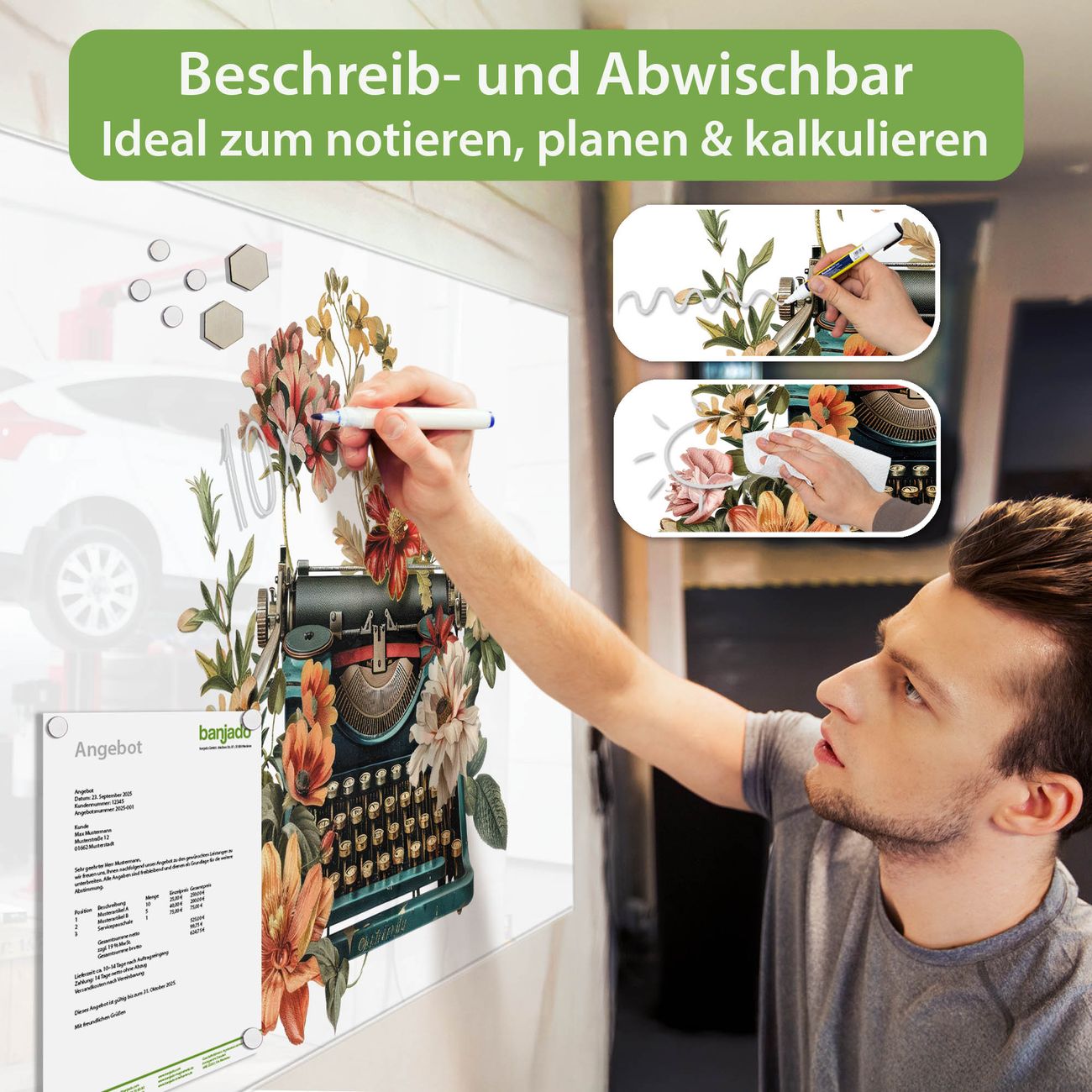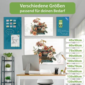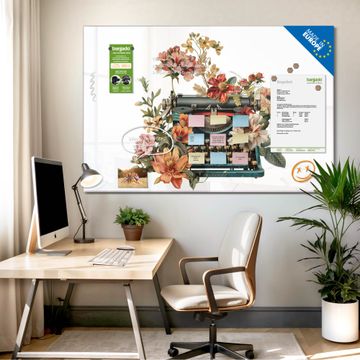Material: 4mm Sicherheitsglas mit Metallrückwand Eigenschaften: beschreibbar, magnetisch, kratzfest Maße: 75x50x0,6cm, 5,63kg schwer Motiv Nummer 13381 Blumige Schreibmaschine Zubehör: inklusive 4 Neodym-Magnete