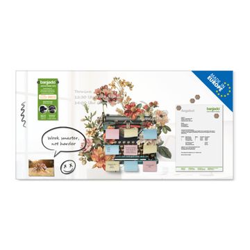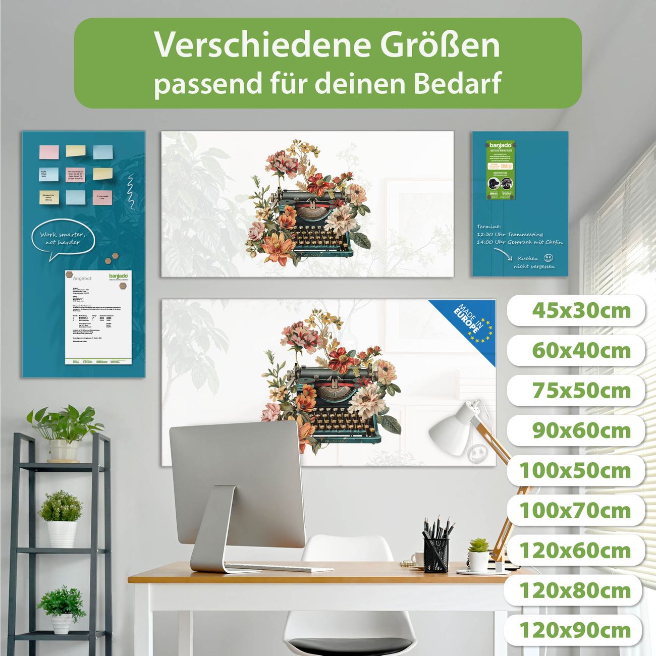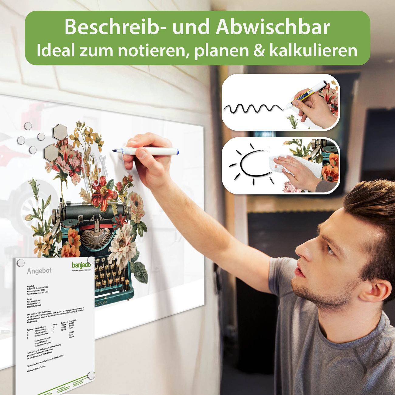 Material: 4mm Sicherheitsglas mit Metallrückwand Eigenschaften: beschreibbar, magnetisch, kratzfest Maße: 100x50x0,6cm, 7,50kg schwer Motiv Nummer 13381 Blumige Schreibmaschine Zubehör: inklusive 4 Neodym-Magnete