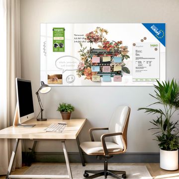 Die banjado Glas Magnettafel mit dem Motiv Motiv Blumige Schreibmaschine verbindet Funktionalität mit Stil. Sie ersetzt das Zettelchaos durch klare Strukturen und bringt dabei eine warme, natürliche Atmosphäre in Ihr Zuhause. Ob im Büro, in der Küche oder im Eingangsbereich - dieses Design-Board zieht Blicke an und sorgt für Ordnung mit Charakter.