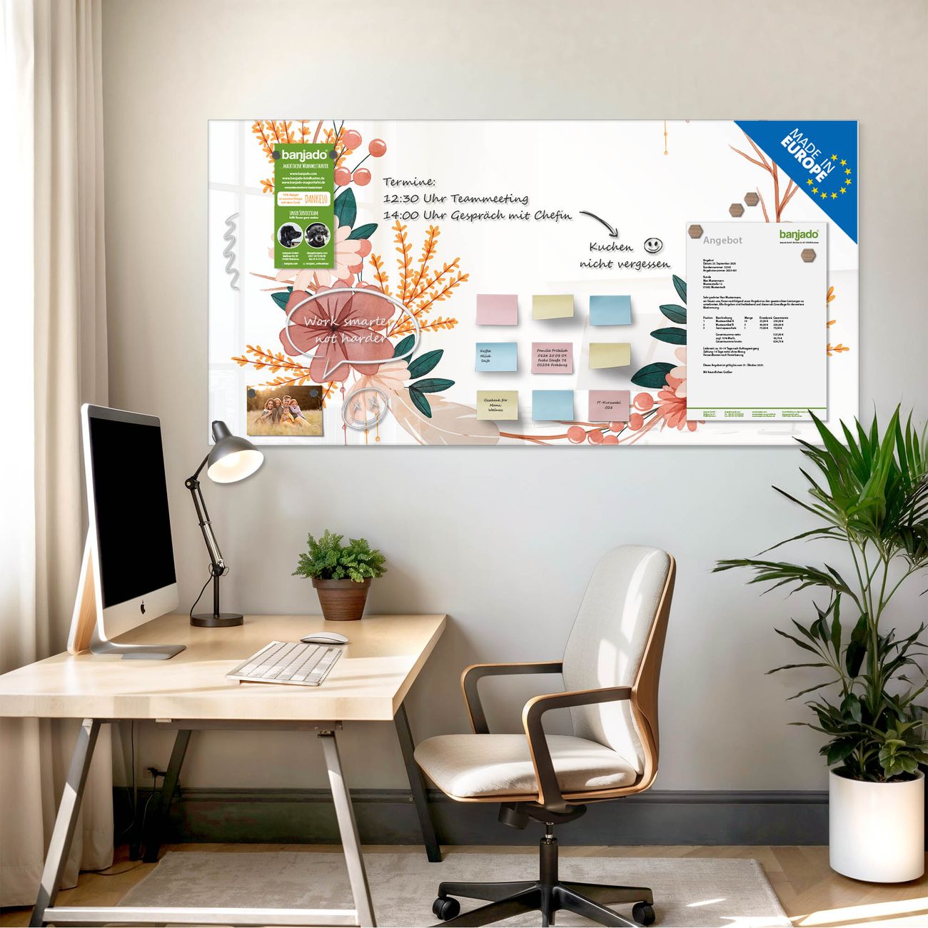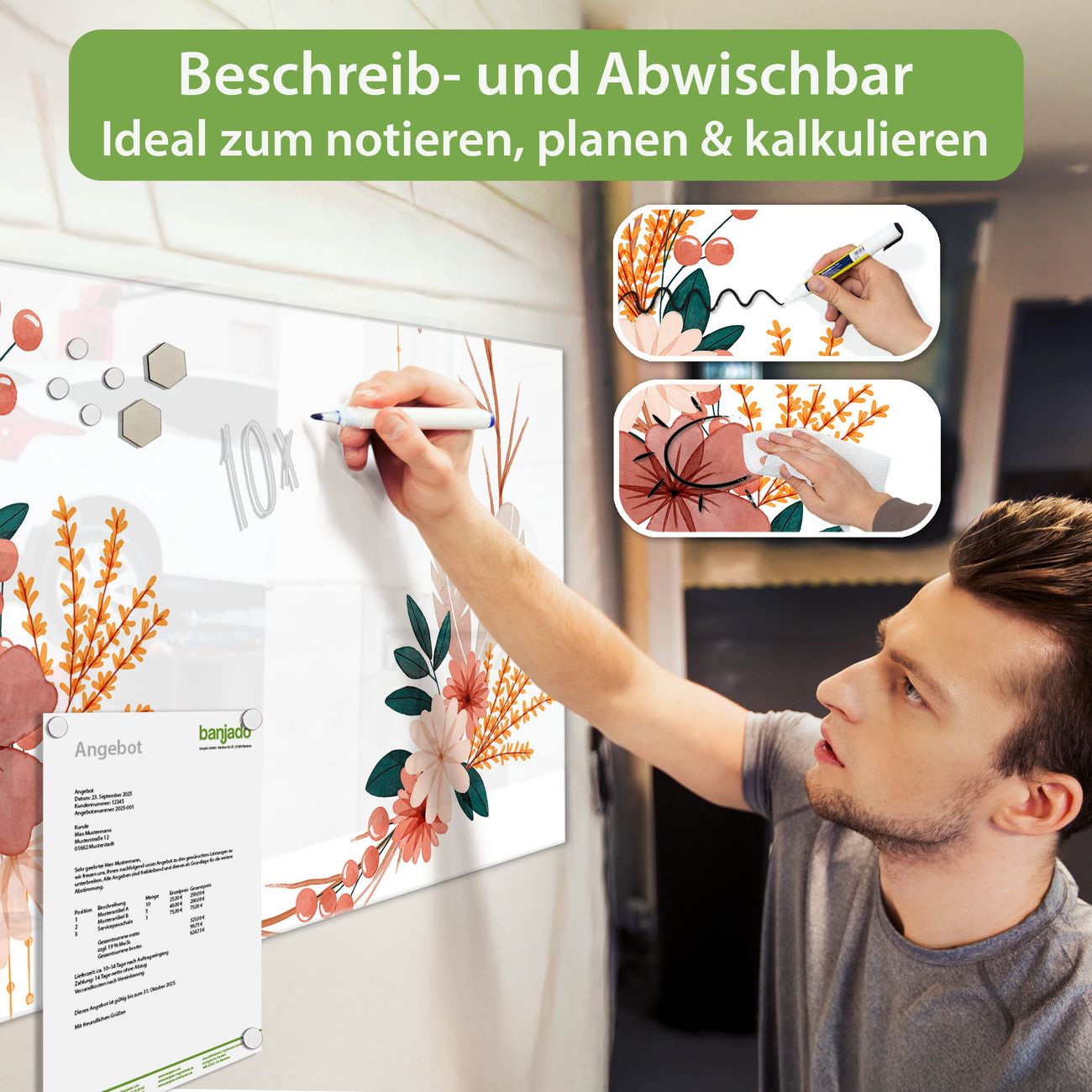 Die banjado Glas Magnettafel mit dem Motiv Motiv Blumiger Kranz verbindet Funktionalität mit Stil. Sie ersetzt das Zettelchaos durch klare Strukturen und bringt dabei eine warme, natürliche Atmosphäre in Ihr Zuhause. Ob im Büro, in der Küche oder im Eingangsbereich - dieses Design-Board zieht Blicke an und sorgt für Ordnung mit Charakter.