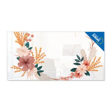 Material: 4mm Sicherheitsglas mit Metallrückwand Eigenschaften: beschreibbar, magnetisch, kratzfest Maße: 100x50x0,6cm, 7,50kg schwer Motiv Nummer 13517 Blumiger Kranz Zubehör: inklusive 4 Neodym-Magnete