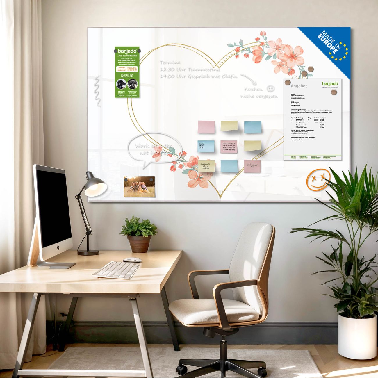 Die banjado Glas Magnettafel mit dem Motiv Motiv Blumiges Herz verbindet Funktionalität mit Stil. Sie ersetzt das Zettelchaos durch klare Strukturen und bringt dabei eine warme, natürliche Atmosphäre in Ihr Zuhause. Ob im Büro, in der Küche oder im Eingangsbereich - dieses Design-Board zieht Blicke an und sorgt für Ordnung mit Charakter.
