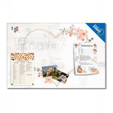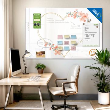 Material: 4mm Sicherheitsglas mit Metallrückwand Eigenschaften: beschreibbar, magnetisch, kratzfest Maße: 75x50x0,6cm, 5,63kg schwer Motiv Nummer 13531 Blumiges Herz Zubehör: inklusive 4 Neodym-Magnete