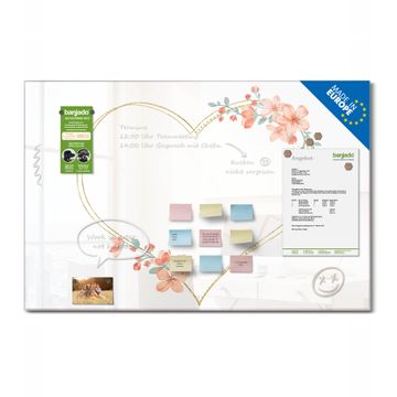 Die banjado Glas Magnettafel mit dem Motiv Motiv Blumiges Herz verbindet Funktionalität mit Stil. Sie ersetzt das Zettelchaos durch klare Strukturen und bringt dabei eine warme, natürliche Atmosphäre in Ihr Zuhause. Ob im Büro, in der Küche oder im Eingangsbereich - dieses Design-Board zieht Blicke an und sorgt für Ordnung mit Charakter.