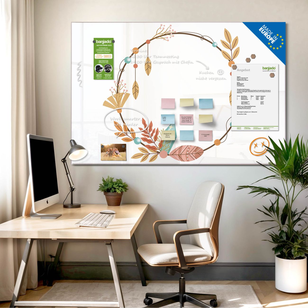 Die banjado Glas Magnettafel mit dem Motiv Motiv Boho Herbstkranz verbindet Funktionalität mit Stil. Sie ersetzt das Zettelchaos durch klare Strukturen und bringt dabei eine warme, natürliche Atmosphäre in Ihr Zuhause. Ob im Büro, in der Küche oder im Eingangsbereich - dieses Design-Board zieht Blicke an und sorgt für Ordnung mit Charakter.