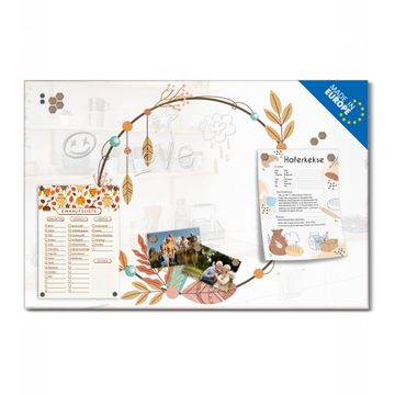 Material: 4mm Sicherheitsglas mit Metallrückwand Eigenschaften: beschreibbar, magnetisch, kratzfest Maße: 75x50x0,6cm, 5,63kg schwer Motiv Nummer 13523 Boho Herbstkranz Zubehör: inklusive 4 Neodym-Magnete