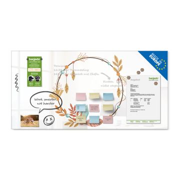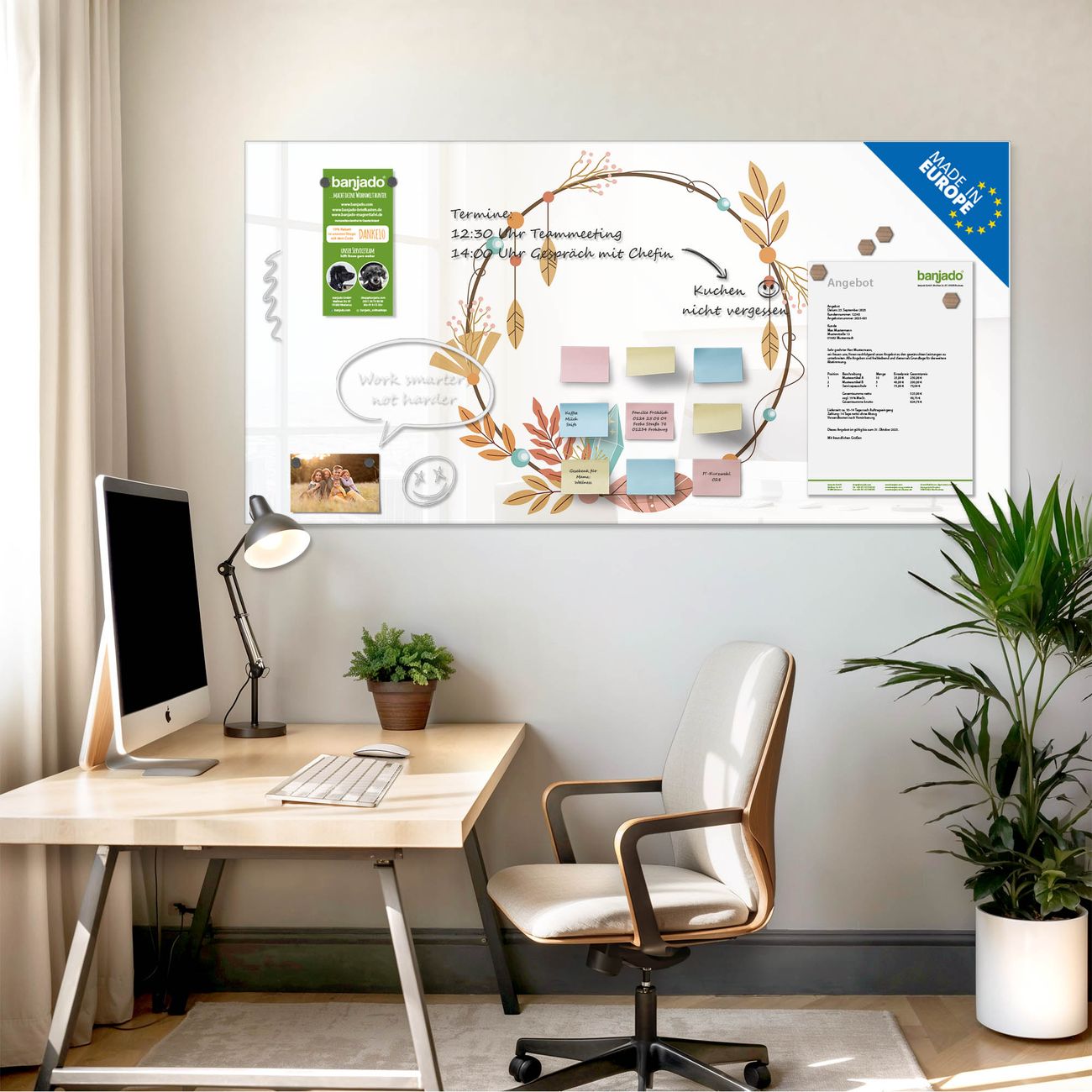 Material: 4mm Sicherheitsglas mit Metallrückwand Eigenschaften: beschreibbar, magnetisch, kratzfest Maße: 100x50x0,6cm, 7,50kg schwer Motiv Nummer 13523 Boho Herbstkranz Zubehör: inklusive 4 Neodym-Magnete