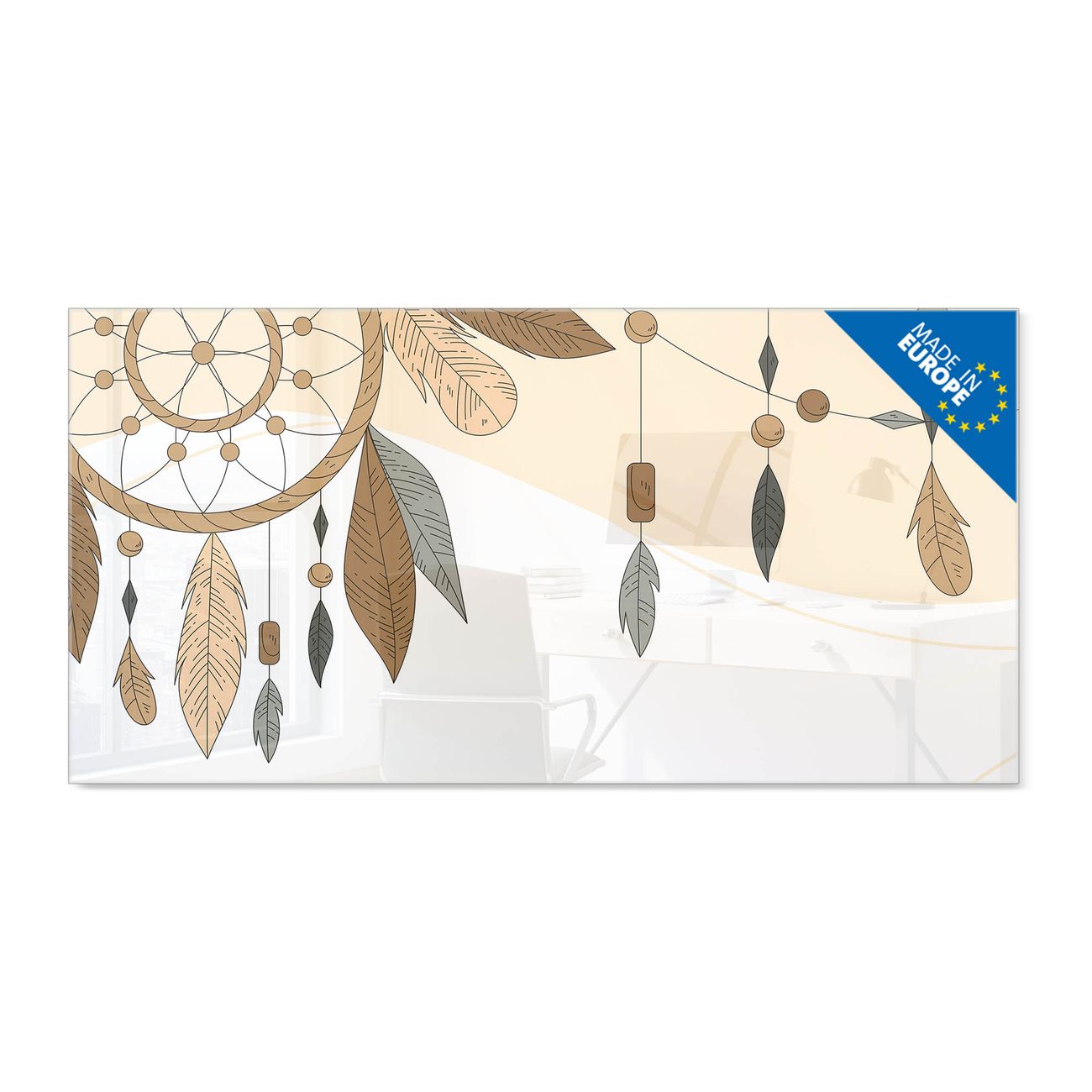Material: 4mm Sicherheitsglas mit Metallrückwand Eigenschaften: beschreibbar, magnetisch, kratzfest Maße: 100x50x0,6cm, 7,50kg schwer Motiv Nummer 13165 Boho Traumfänger Zubehör: inklusive 4 Neodym-Magnete