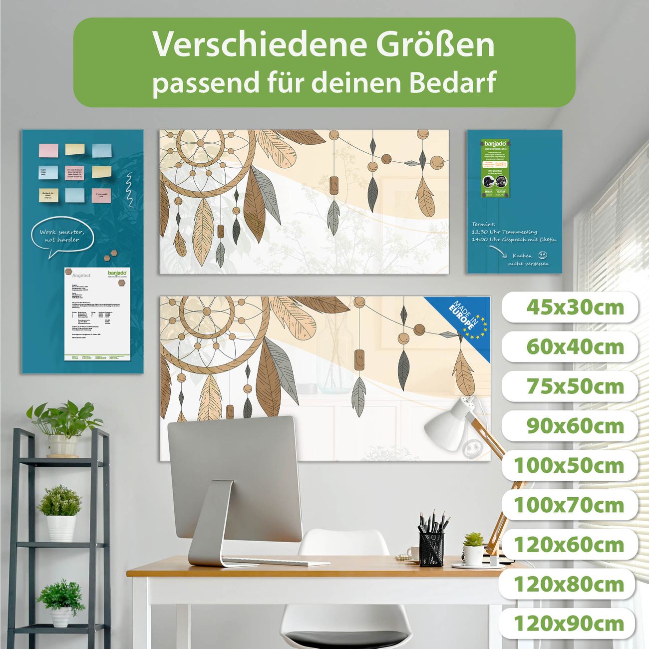 Ein Stück Design, das Ihren Alltag organisiert. Schreiben, heften, inspirieren - alles an einem Ort. Qualität, die man spürt. Montage leicht gemacht. Handwerk mit Herz - veredelt in Sachsen. Einzigartiges Design mit Motiv Motiv Boho Traumfänger Beschreibbare Glasoberfläche, leicht zu reinigen Starke Magnetkraft durch Stahlrückwand Inklusive 4 Neodym-Magneten Flexible Montageoptionen Handveredelt in Sachsen - Qualität, die bleibt
