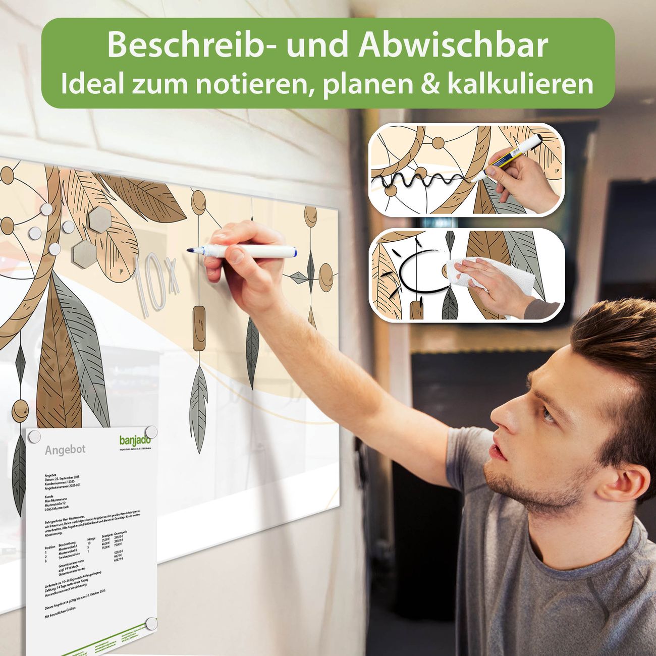 Jede Glas Magnettafel wird in unserer Werkstatt von Hand gefertigt und sorgfältig geprüft. So erhalten Sie ein echtes Qualitätsprodukt, das Funktion und Ästhetik perfekt vereint.?? Warum banjado?