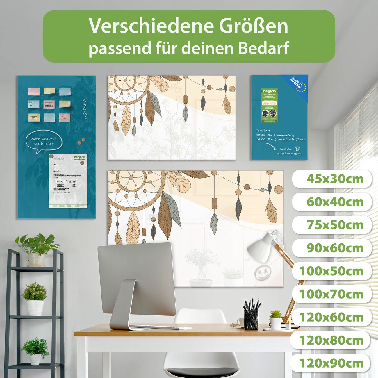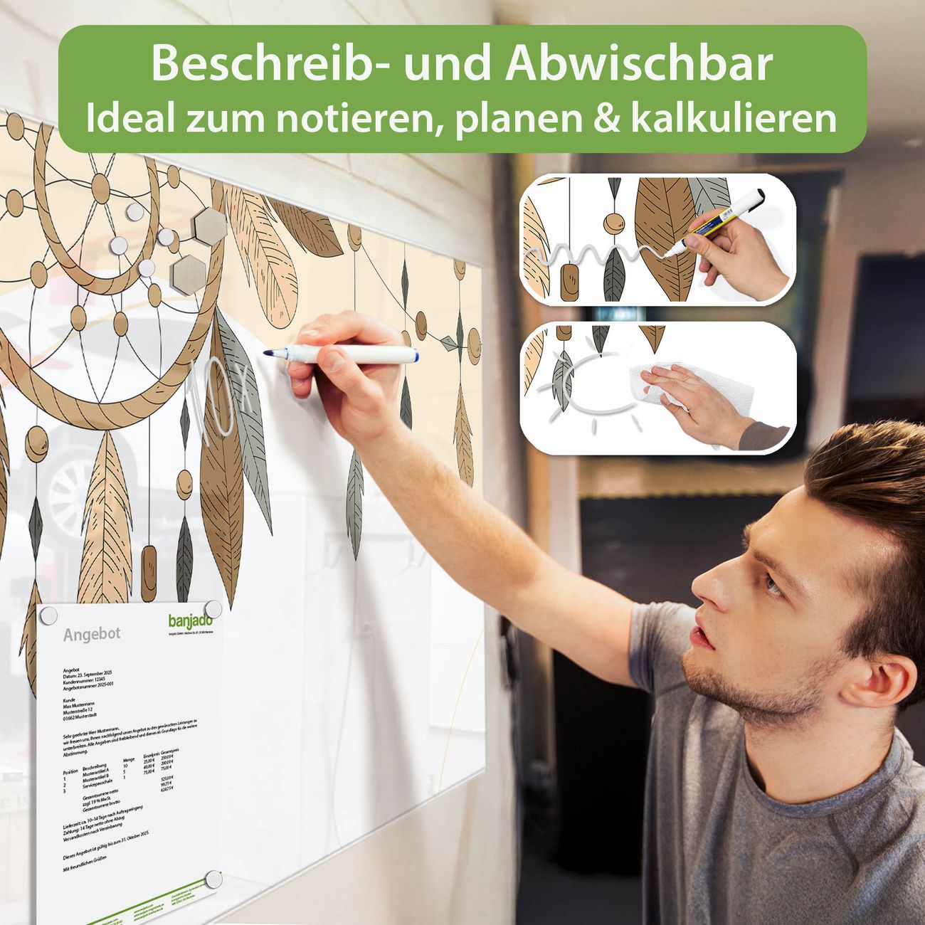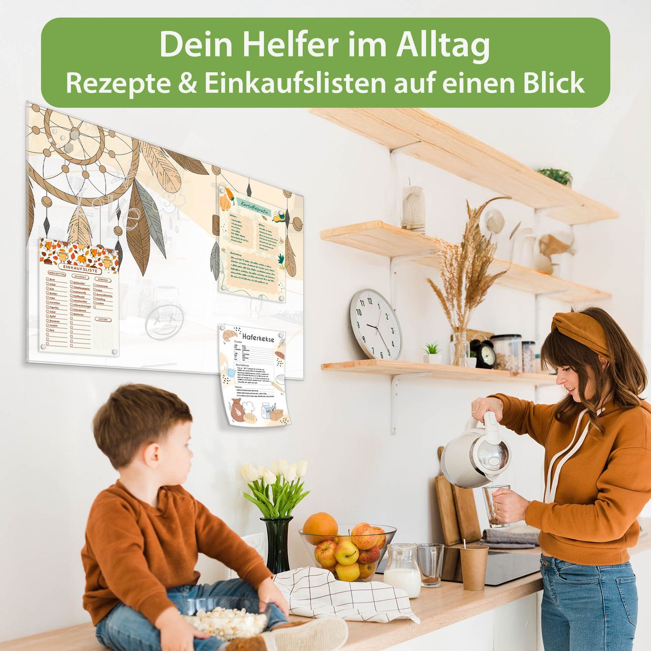 Ein Stück Design, das Ihren Alltag organisiert. Schreiben, heften, inspirieren - alles an einem Ort. Qualität, die man spürt. Montage leicht gemacht. Handwerk mit Herz - veredelt in Sachsen. Einzigartiges Design mit Motiv Motiv Boho Traumfänger Beschreibbare Glasoberfläche, leicht zu reinigen Starke Magnetkraft durch Stahlrückwand Inklusive 4 Neodym-Magneten Flexible Montageoptionen Handveredelt in Sachsen - Qualität, die bleibt