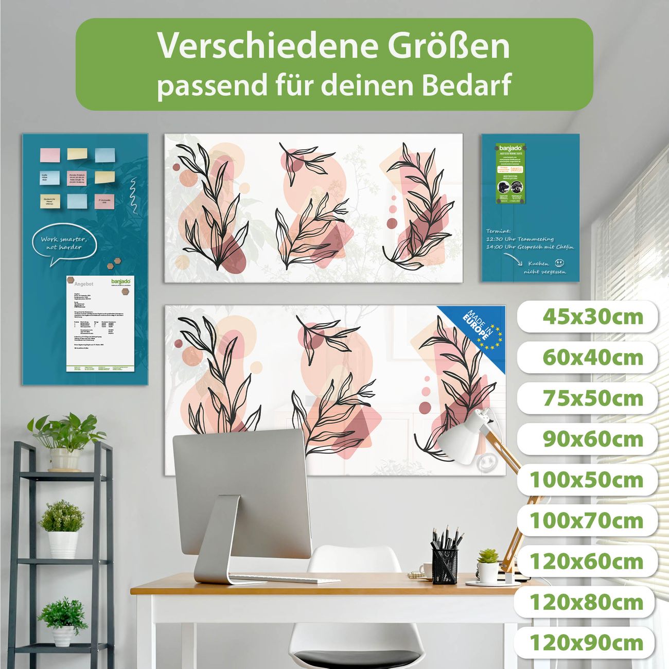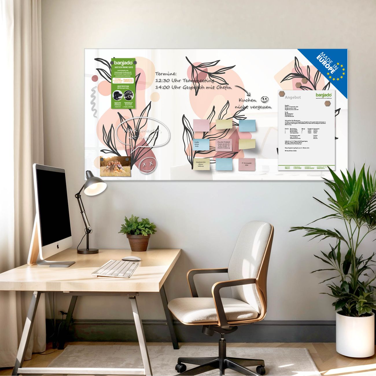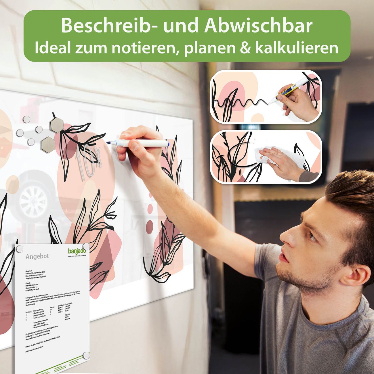 Jede Glas Magnettafel wird in unserer Werkstatt von Hand gefertigt und sorgfältig geprüft. So erhalten Sie ein echtes Qualitätsprodukt, das Funktion und Ästhetik perfekt vereint.?? Warum banjado?