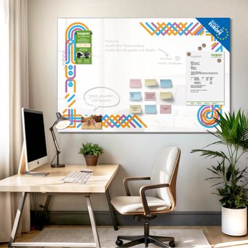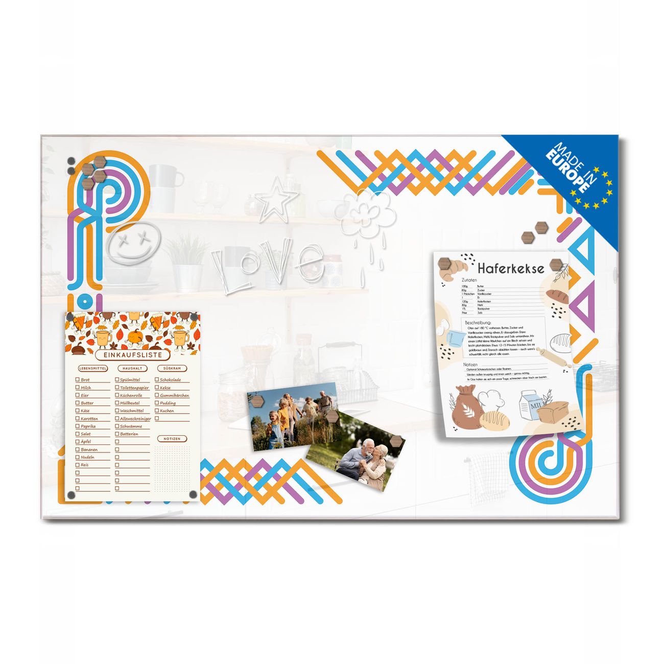 Material: 4mm Sicherheitsglas mit Metallrückwand Eigenschaften: beschreibbar, magnetisch, kratzfest Maße: 75x50x0,6cm, 5,63kg schwer Motiv Nummer 13577 Bunte Eckverzierung Zubehör: inklusive 4 Neodym-Magnete