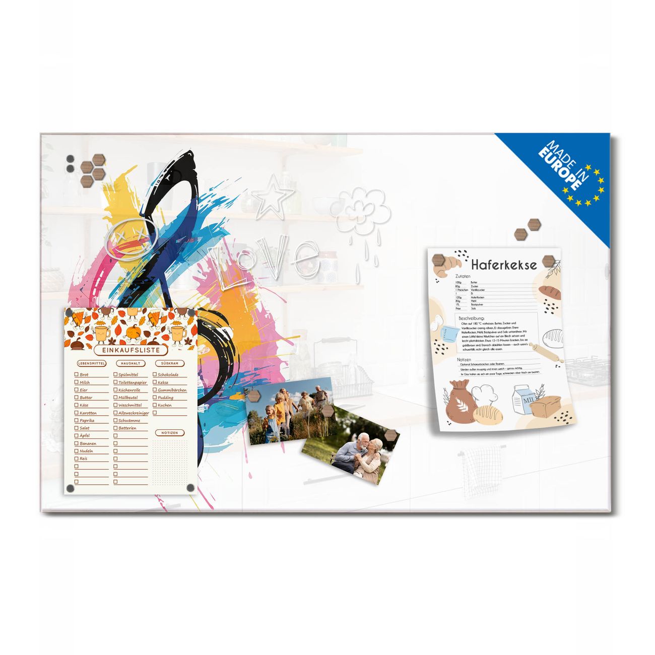 Ein Stück Design, das Ihren Alltag organisiert. Schreiben, heften, inspirieren - alles an einem Ort. Qualität, die man spürt. Montage leicht gemacht. Handwerk mit Herz - veredelt in Sachsen. Einzigartiges Design mit Motiv Motiv Bunte Notenpalette Beschreibbare Glasoberfläche, leicht zu reinigen Starke Magnetkraft durch Stahlrückwand Inklusive 4 Neodym-Magneten Flexible Montageoptionen Handveredelt in Sachsen - Qualität, die bleibt