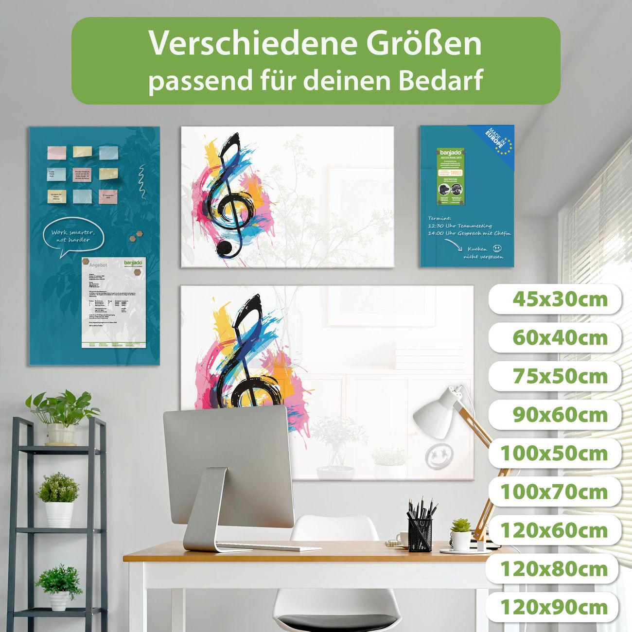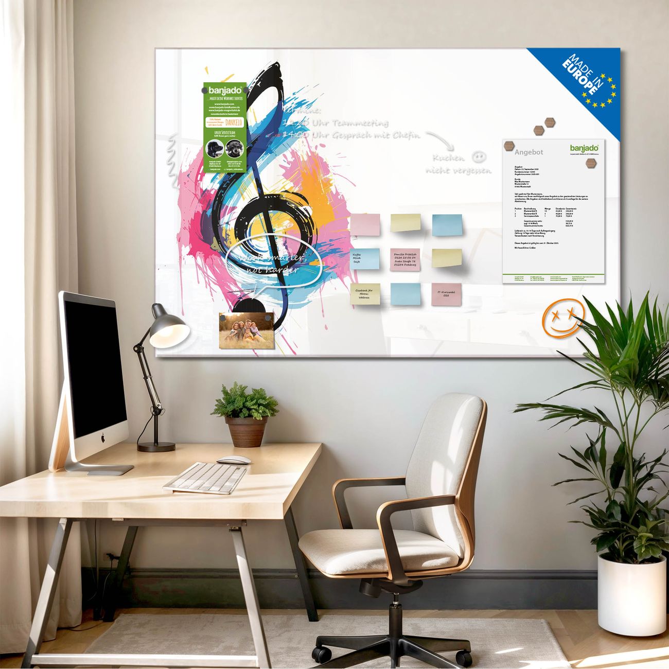 Material: 4mm Sicherheitsglas mit Metallrückwand Eigenschaften: beschreibbar, magnetisch, kratzfest Maße: 120x80x0,6cm, 14,40kg schwer Motiv Nummer 13323 Bunte Notenpalette Zubehör: inklusive 4 Neodym-Magnete