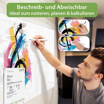Auf der glatten Glasoberfläche lassen sich Termine, Rezepte oder Notizen ganz einfach mit Kreidestiften festhalten und rückstandslos entfernen. Starke Neodym-Magnete halten Ihre wichtigsten Erinnerungen sicher an Ort und Stelle. So entsteht Ihre ganz persönliche Ideenwand - jeden Tag neu.