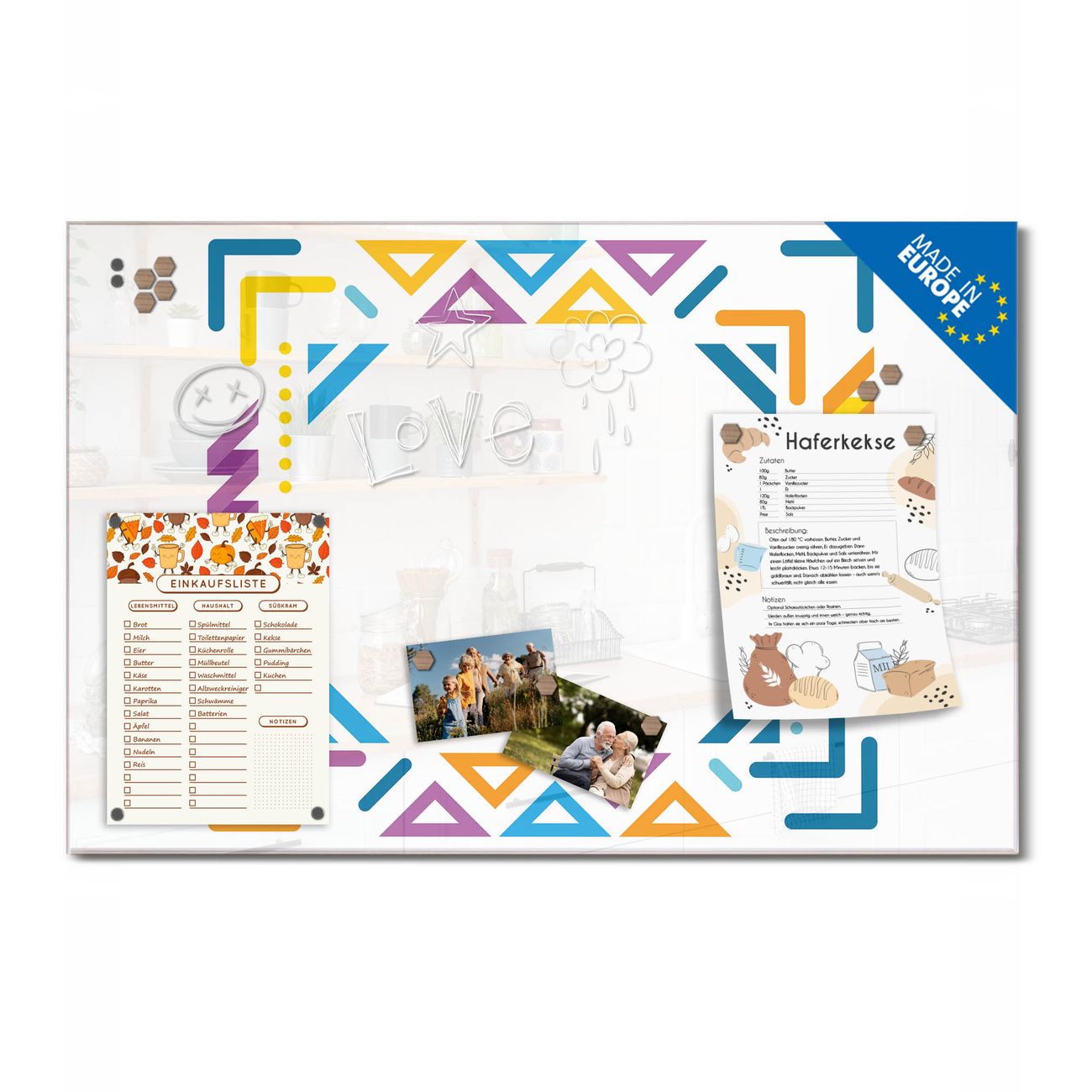 Material: 4mm Sicherheitsglas mit Metallrückwand Eigenschaften: beschreibbar, magnetisch, kratzfest Maße: 75x50x0,6cm, 5,63kg schwer Motiv Nummer 13576 Bunter Geometrischer Rahmen Zubehör: inklusive 4 Neodym-Magnete