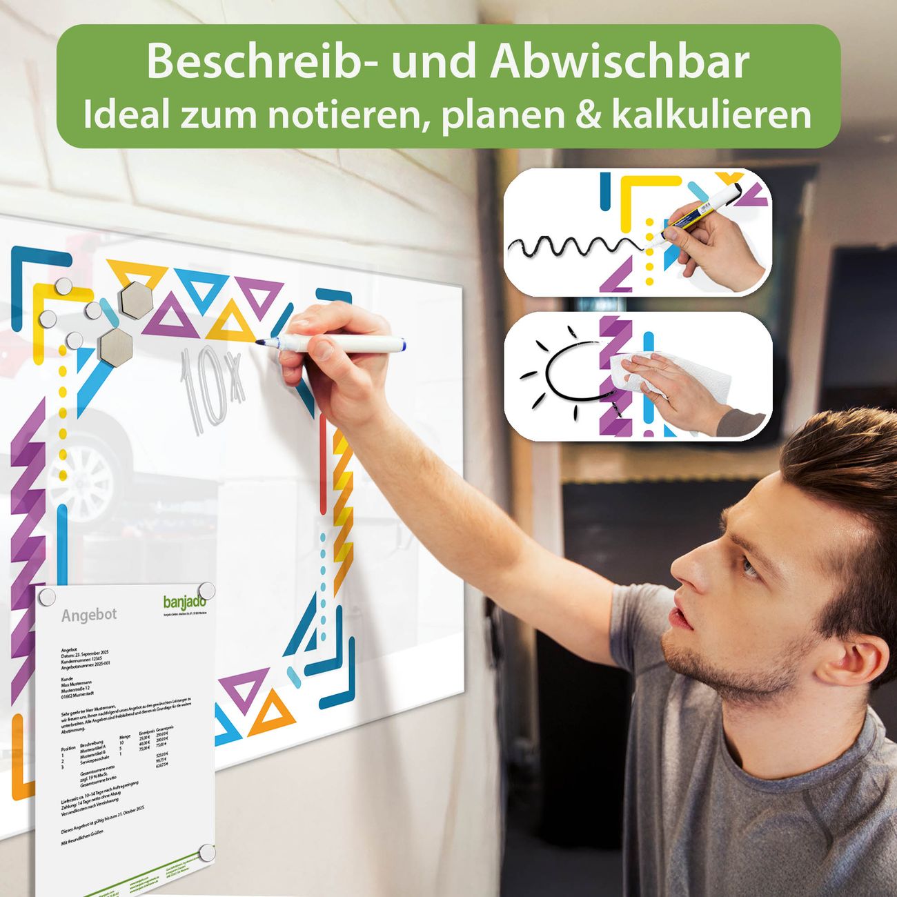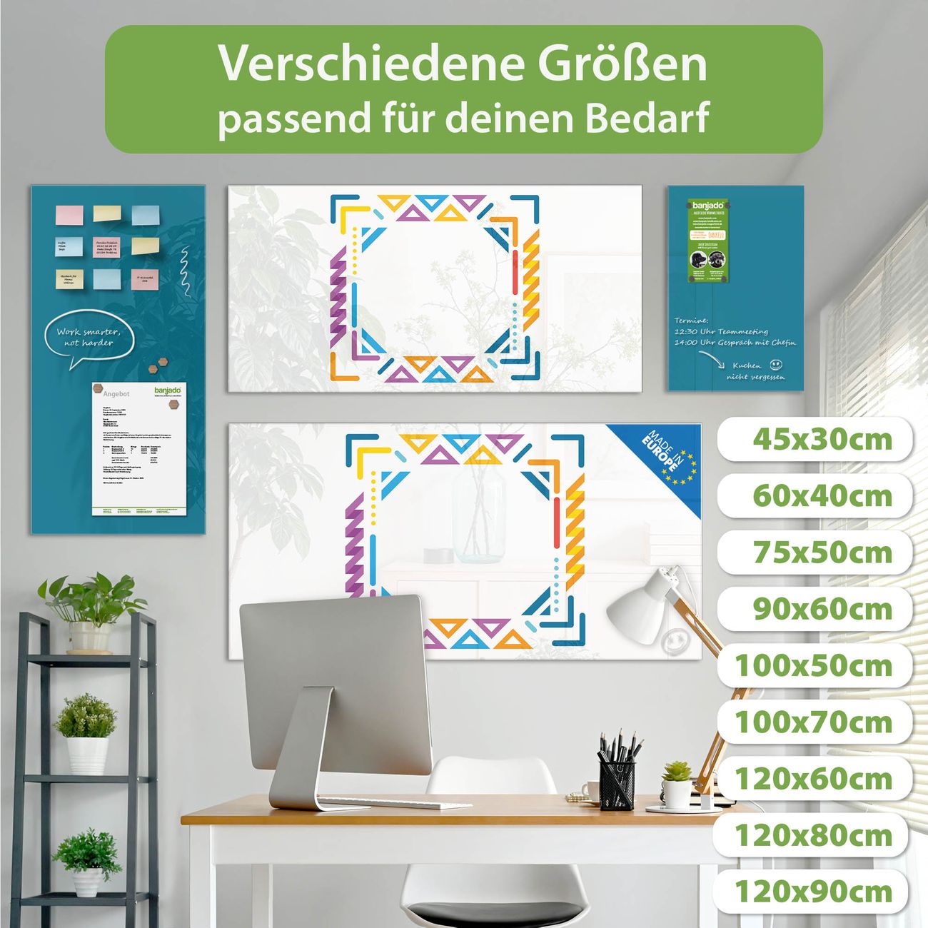 Material: 4mm Sicherheitsglas mit Metallrückwand Eigenschaften: beschreibbar, magnetisch, kratzfest Maße: 100x50x0,6cm, 7,50kg schwer Motiv Nummer 13576 Bunter Geometrischer Rahmen Zubehör: inklusive 4 Neodym-Magnete