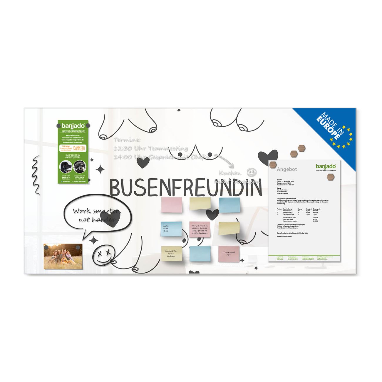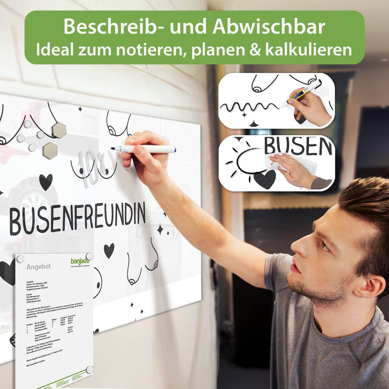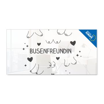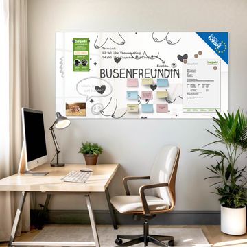 Material: 4mm Sicherheitsglas mit Metallrückwand Eigenschaften: beschreibbar, magnetisch, kratzfest Maße: 100x50x0,6cm, 7,50kg schwer Motiv Nummer 13113 Busenfreundin 2 Zubehör: inklusive 4 Neodym-Magnete