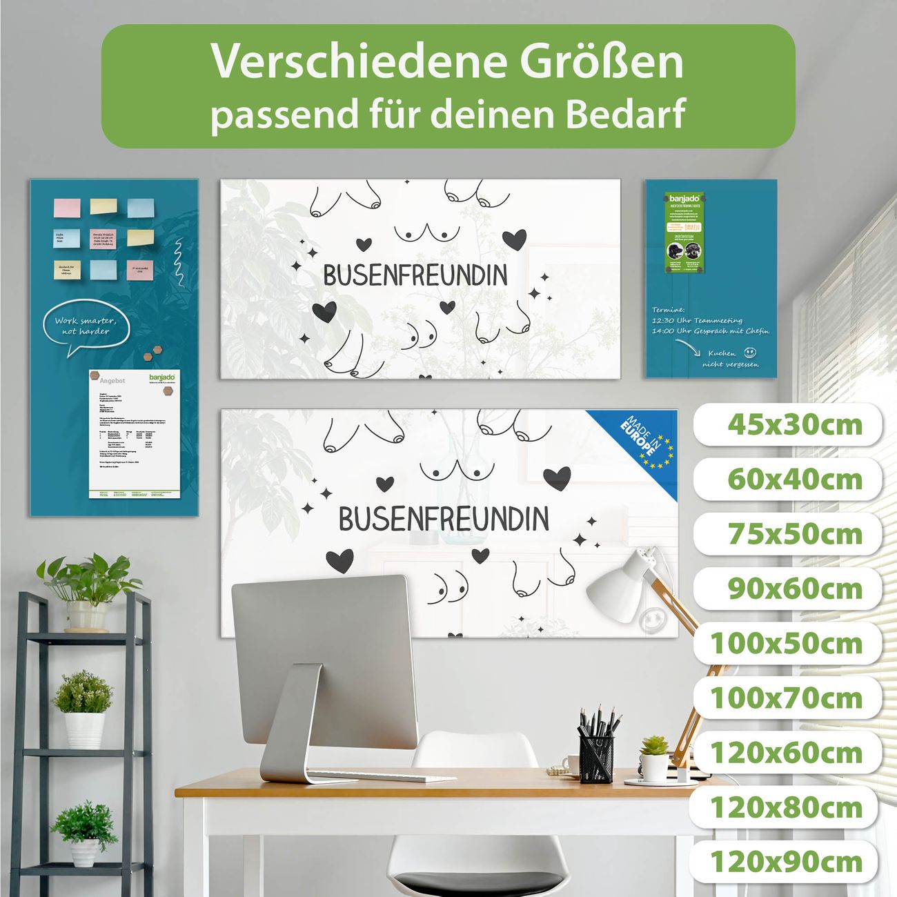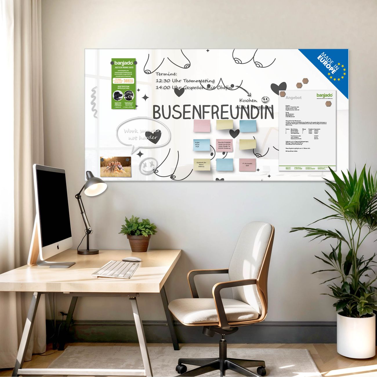 Jede Glas Magnettafel wird in unserer Werkstatt von Hand gefertigt und sorgfältig geprüft. So erhalten Sie ein echtes Qualitätsprodukt, das Funktion und Ästhetik perfekt vereint.?? Warum banjado?