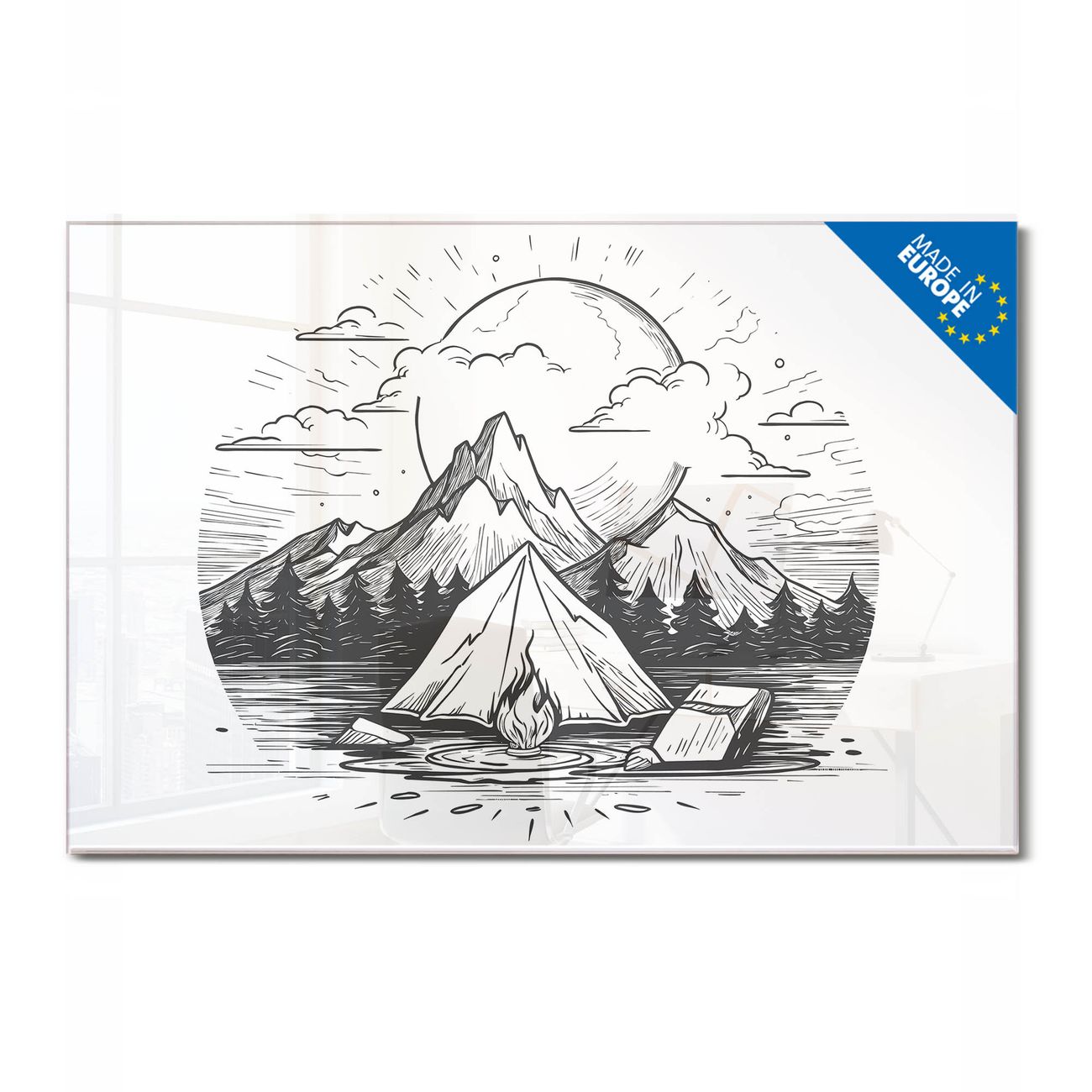 Material: 4mm Sicherheitsglas mit Metallrückwand Eigenschaften: beschreibbar, magnetisch, kratzfest Maße: 75x50x0,6cm, 5,63kg schwer Motiv Nummer 13349 Camping im Mondschein Zubehör: inklusive 4 Neodym-Magnete