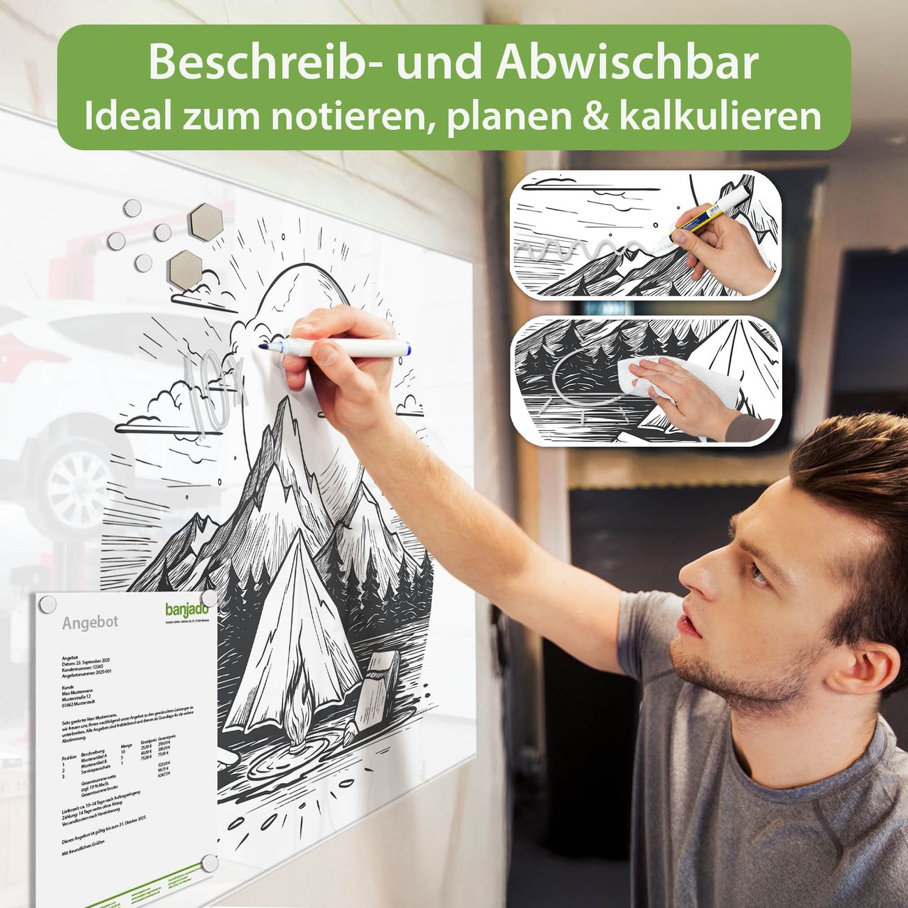 Jede Glas Magnettafel wird in unserer Werkstatt von Hand gefertigt und sorgfältig geprüft. So erhalten Sie ein echtes Qualitätsprodukt, das Funktion und Ästhetik perfekt vereint.?? Warum banjado?