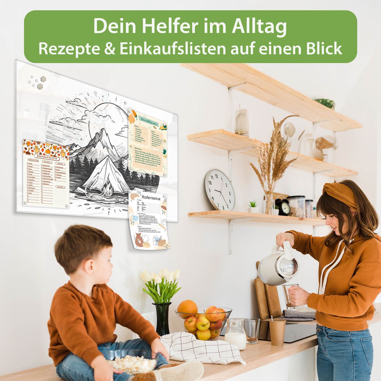 Auf der glatten Glasoberfläche lassen sich Termine, Rezepte oder Notizen ganz einfach mit Kreidestiften festhalten und rückstandslos entfernen. Starke Neodym-Magnete halten Ihre wichtigsten Erinnerungen sicher an Ort und Stelle. So entsteht Ihre ganz persönliche Ideenwand - jeden Tag neu.
