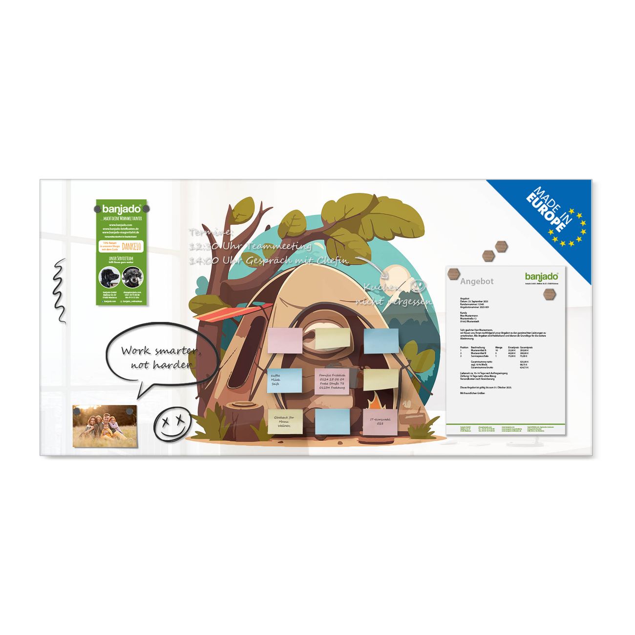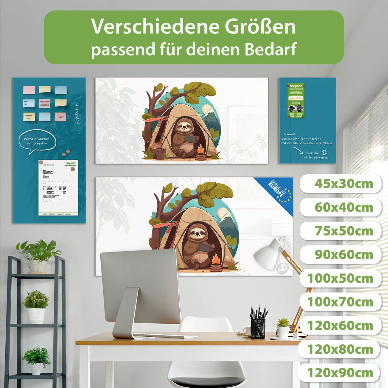 Material: 4mm Sicherheitsglas mit Metallrückwand Eigenschaften: beschreibbar, magnetisch, kratzfest Maße: 100x50x0,6cm, 7,50kg schwer Motiv Nummer 13459 Camping mit Faultier Zubehör: inklusive 4 Neodym-Magnete