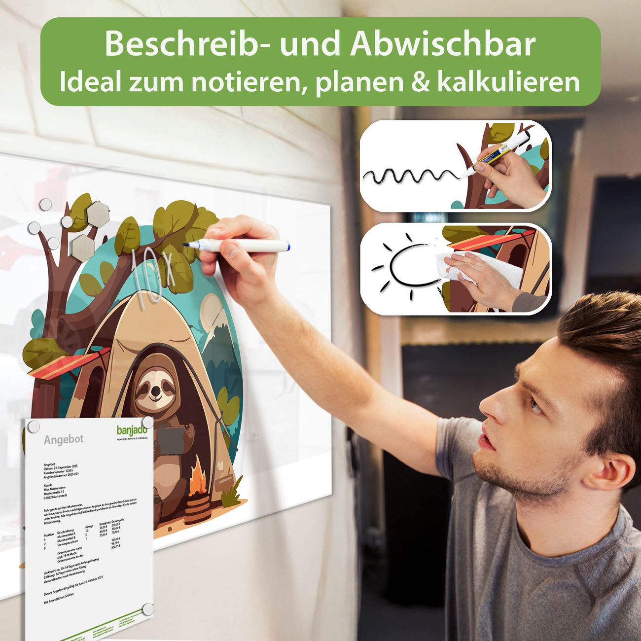 Die banjado Glas Magnettafel mit dem Motiv Motiv Camping mit Faultier verbindet Funktionalität mit Stil. Sie ersetzt das Zettelchaos durch klare Strukturen und bringt dabei eine warme, natürliche Atmosphäre in Ihr Zuhause. Ob im Büro, in der Küche oder im Eingangsbereich - dieses Design-Board zieht Blicke an und sorgt für Ordnung mit Charakter.
