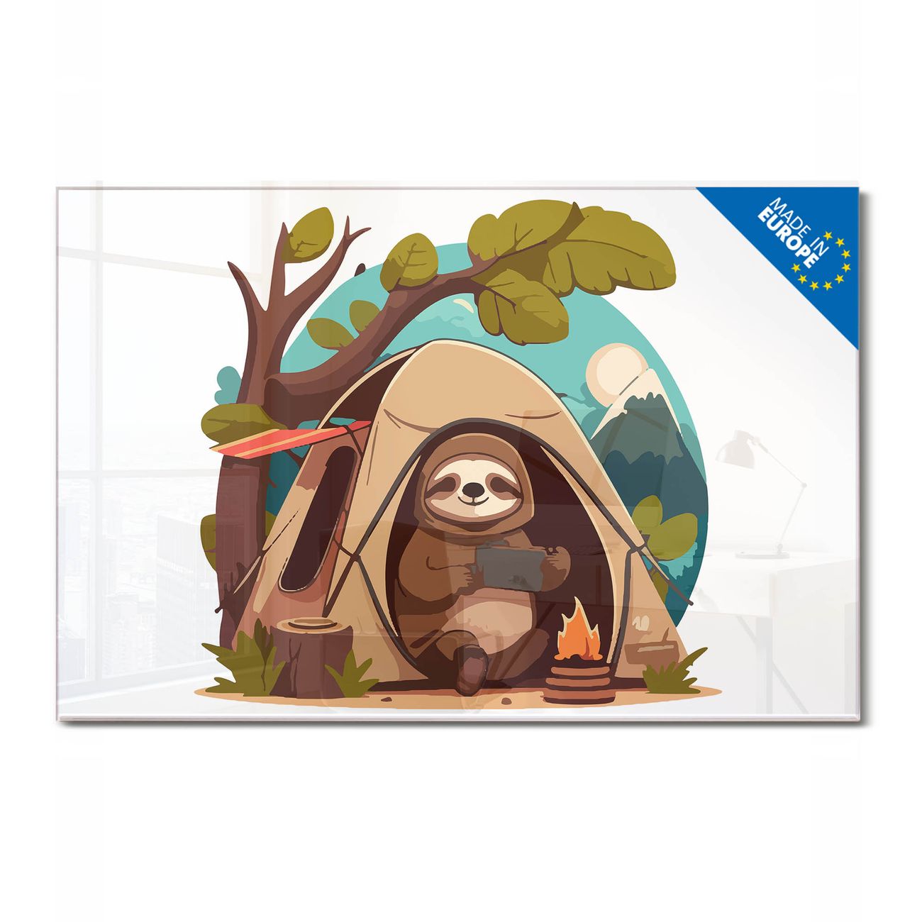 Glas Magnettafel im Querformat Motiv Camping mit Faultier
