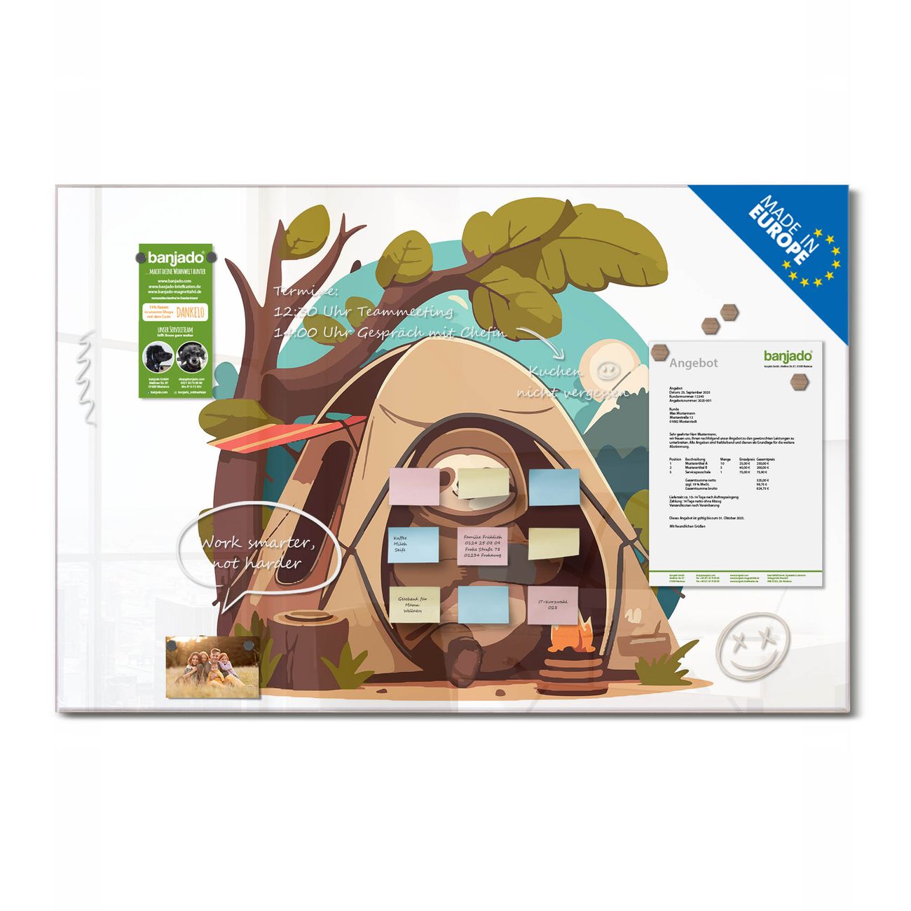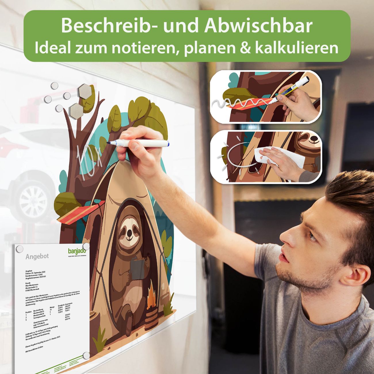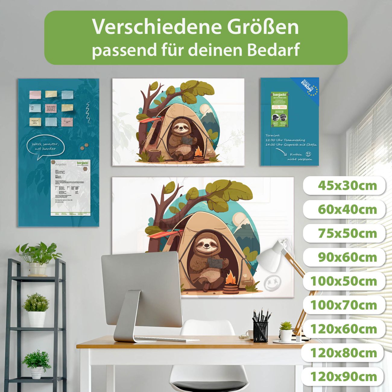 Die banjado Glas Magnettafel mit dem Motiv Motiv Camping mit Faultier verbindet Funktionalität mit Stil. Sie ersetzt das Zettelchaos durch klare Strukturen und bringt dabei eine warme, natürliche Atmosphäre in Ihr Zuhause. Ob im Büro, in der Küche oder im Eingangsbereich - dieses Design-Board zieht Blicke an und sorgt für Ordnung mit Charakter.