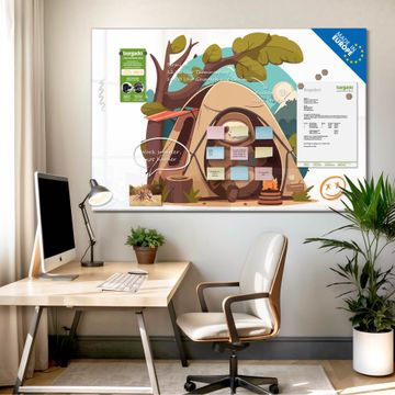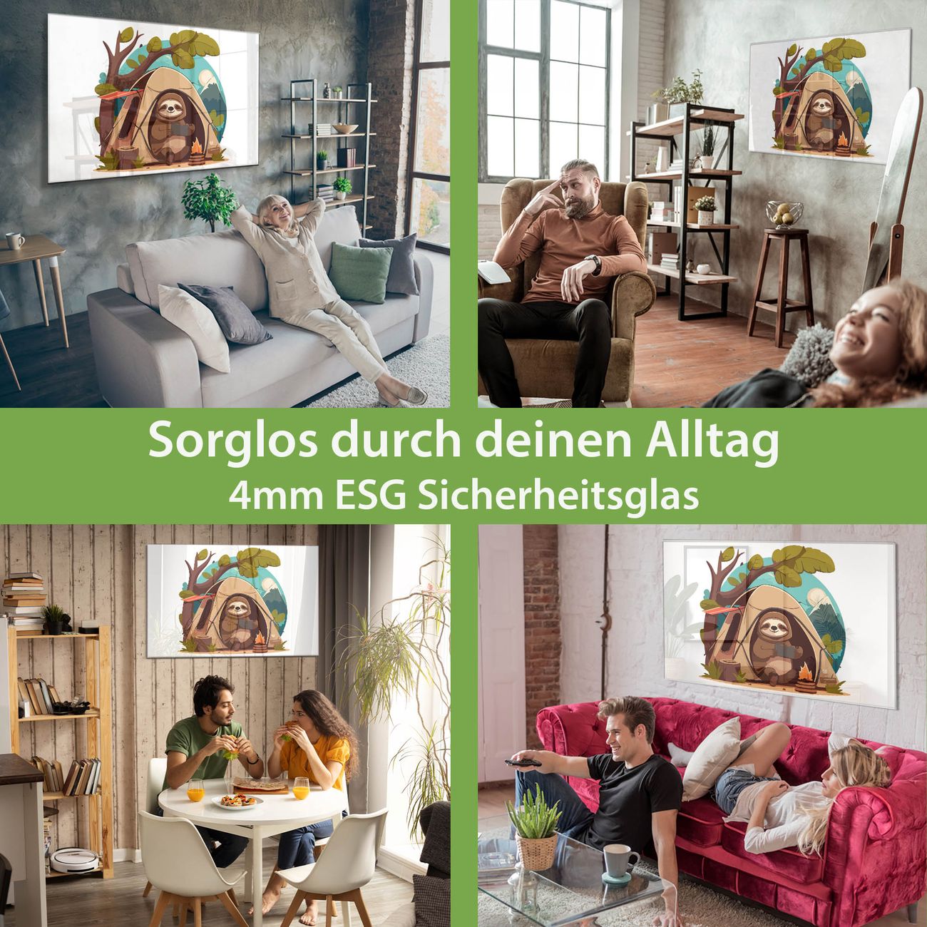 Material: 4mm Sicherheitsglas mit Metallrückwand Eigenschaften: beschreibbar, magnetisch, kratzfest Maße: 120x80x0,6cm, 14,40kg schwer Motiv Nummer 13459 Camping mit Faultier Zubehör: inklusive 4 Neodym-Magnete