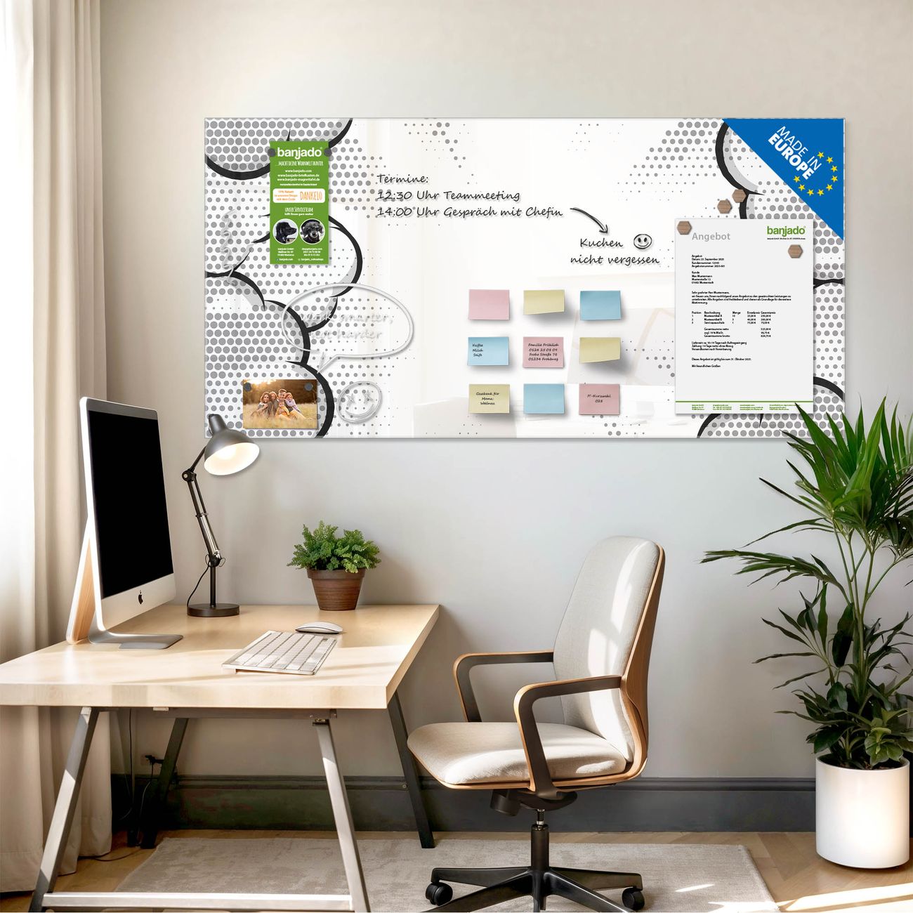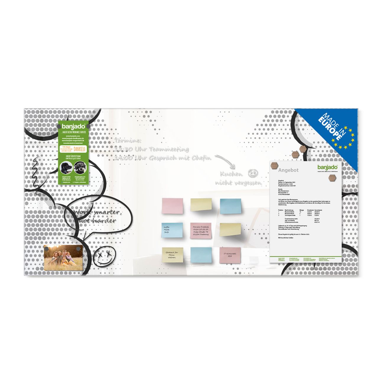 Ein Stück Design, das Ihren Alltag organisiert. Schreiben, heften, inspirieren - alles an einem Ort. Qualität, die man spürt. Montage leicht gemacht. Handwerk mit Herz - veredelt in Sachsen. Einzigartiges Design mit Motiv Motiv Comic Explosion Beschreibbare Glasoberfläche, leicht zu reinigen Starke Magnetkraft durch Stahlrückwand Inklusive 4 Neodym-Magneten Flexible Montageoptionen Handveredelt in Sachsen - Qualität, die bleibt