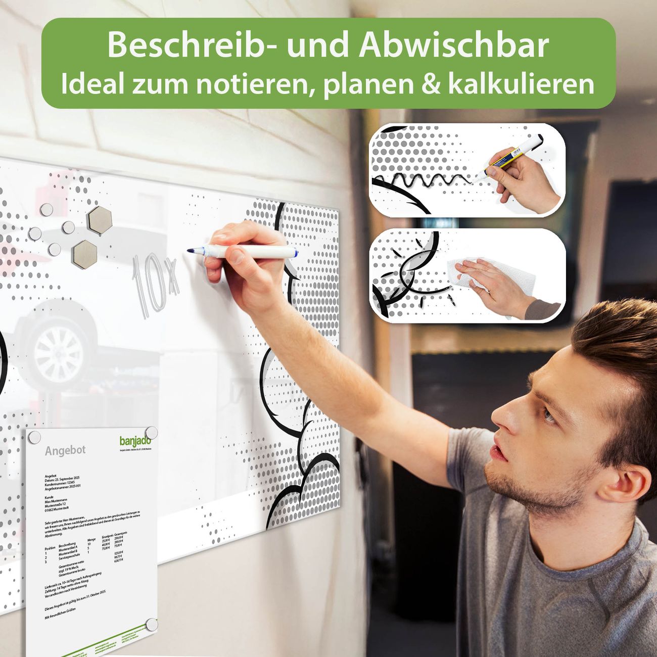 Bitte beachten Sie, dass ausschliessliche spezielle Magnete an der Glastafel haften. Wir empfehlen banjado Neodym Magnete, diese sind durch uns auf Wirksamkeit geprüft.