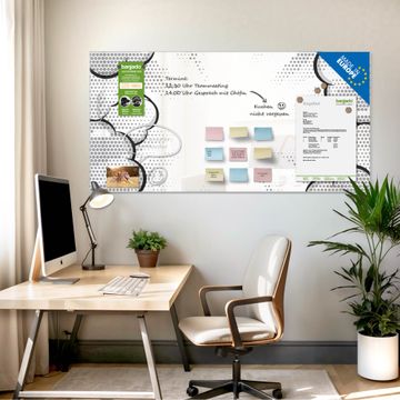 Auf der glatten Glasoberfläche lassen sich Termine, Rezepte oder Notizen ganz einfach mit Kreidestiften festhalten und rückstandslos entfernen. Starke Neodym-Magnete halten Ihre wichtigsten Erinnerungen sicher an Ort und Stelle. So entsteht Ihre ganz persönliche Ideenwand - jeden Tag neu.
