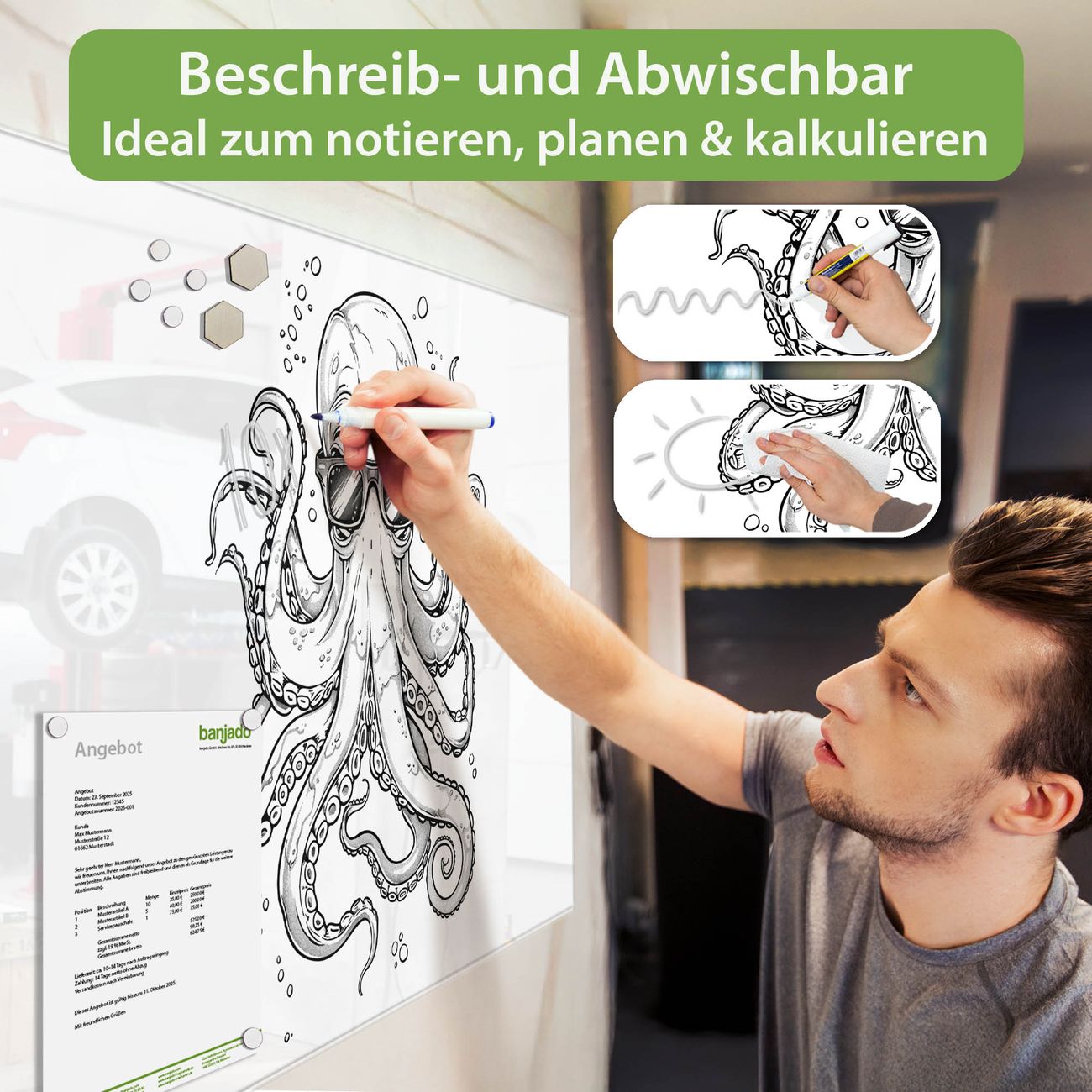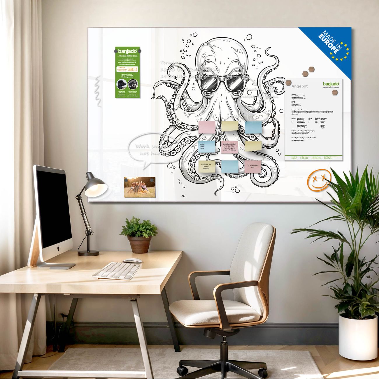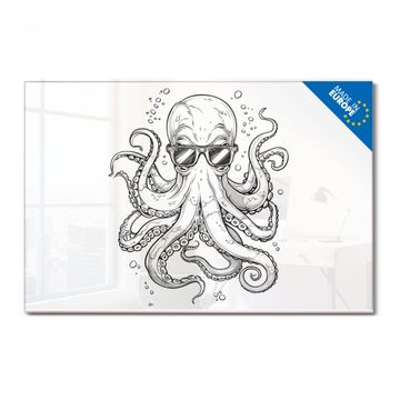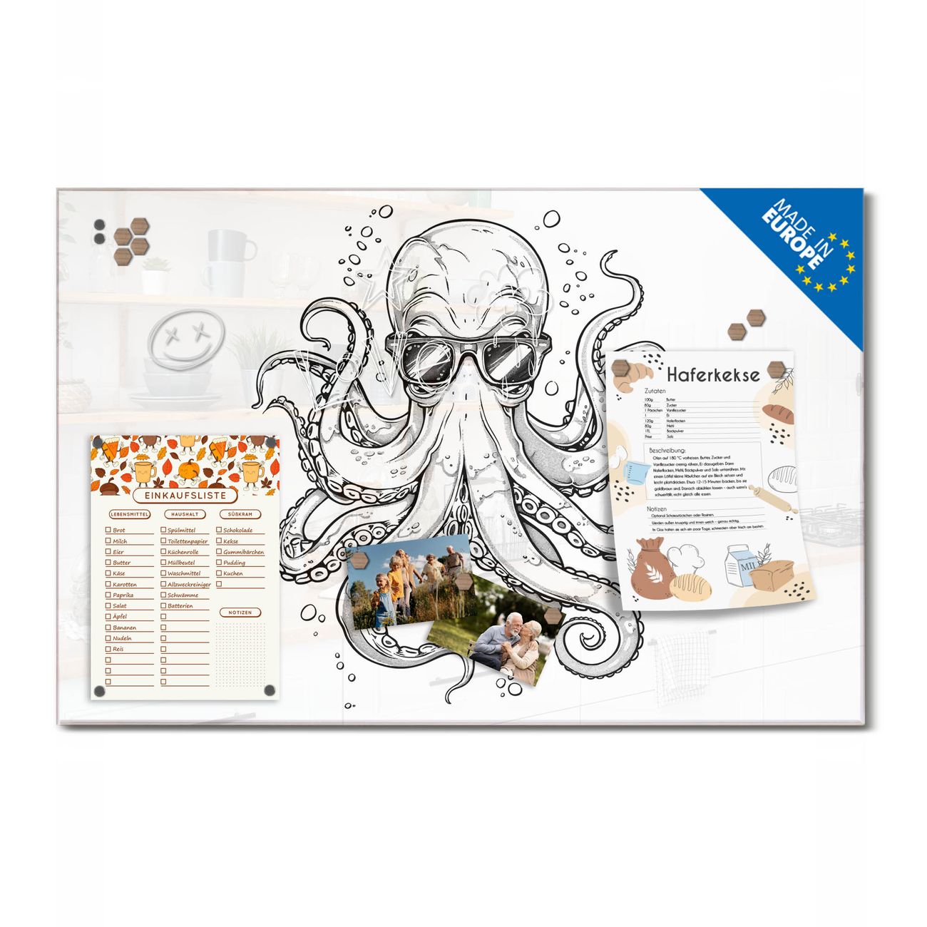 Material: 4mm Sicherheitsglas mit Metallrückwand Eigenschaften: beschreibbar, magnetisch, kratzfest Maße: 75x50x0,6cm, 5,63kg schwer Motiv Nummer 13485 Coole Oktopus-Skizze Zubehör: inklusive 4 Neodym-Magnete