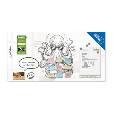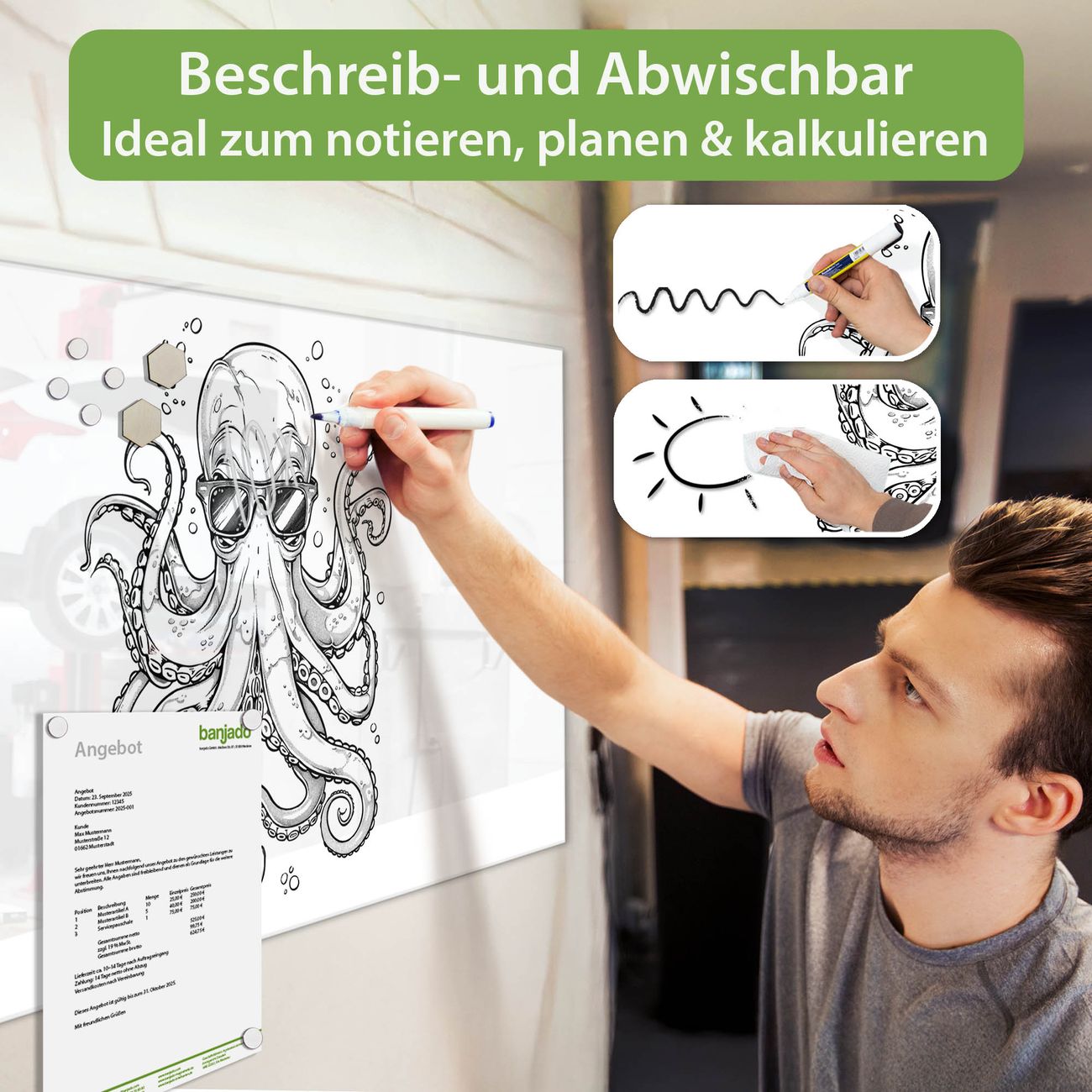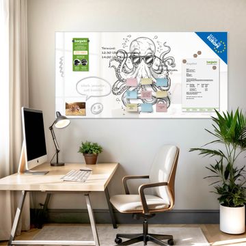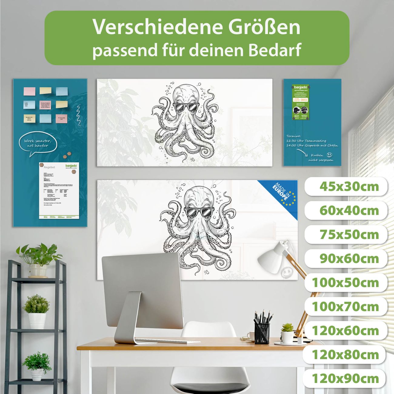 Material: 4mm Sicherheitsglas mit Metallrückwand Eigenschaften: beschreibbar, magnetisch, kratzfest Maße: 100x50x0,6cm, 7,50kg schwer Motiv Nummer 13485 Coole Oktopus-Skizze Zubehör: inklusive 4 Neodym-Magnete