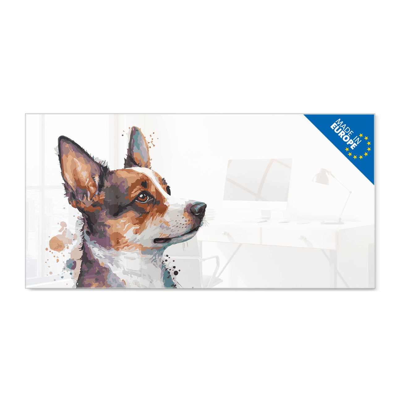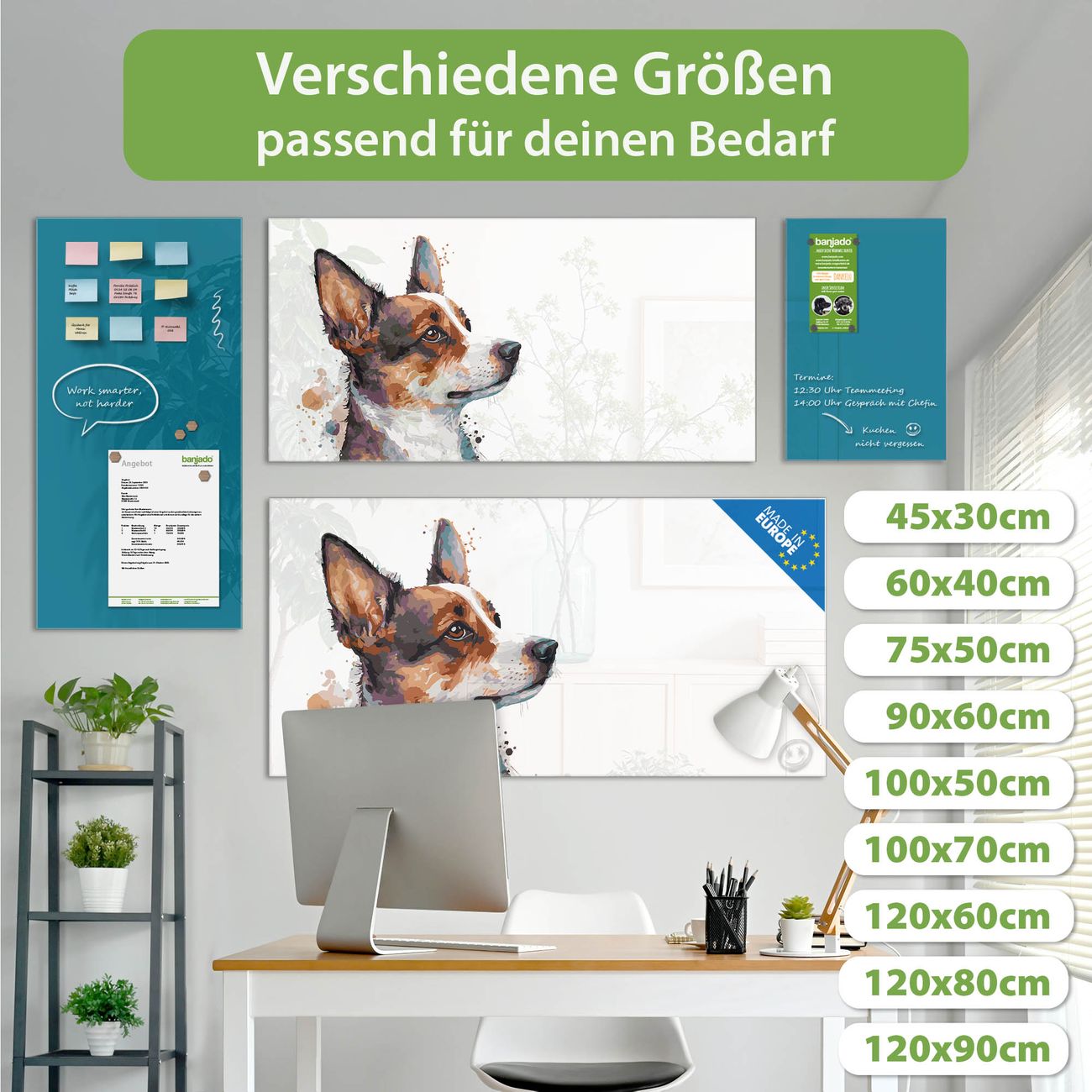 Material: 4mm Sicherheitsglas mit Metallrückwand Eigenschaften: beschreibbar, magnetisch, kratzfest Maße: 100x50x0,6cm, 7,50kg schwer Motiv Nummer 13411 Corgi Aquarell Zubehör: inklusive 4 Neodym-Magnete