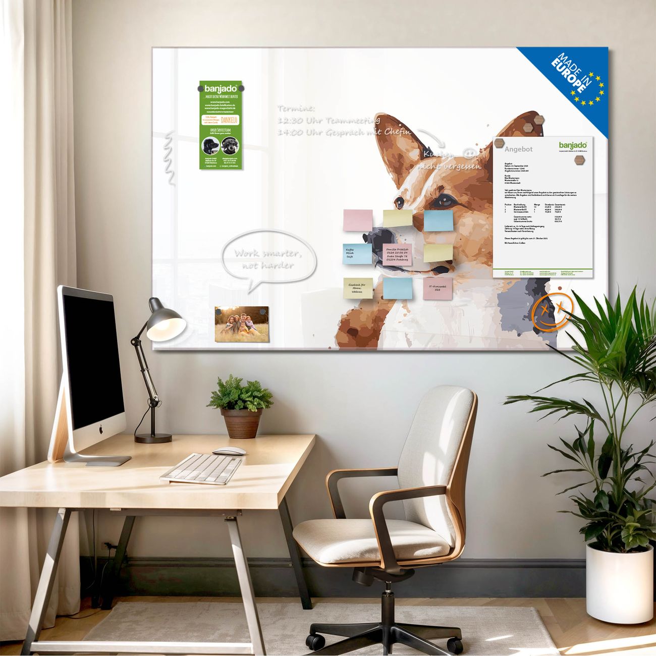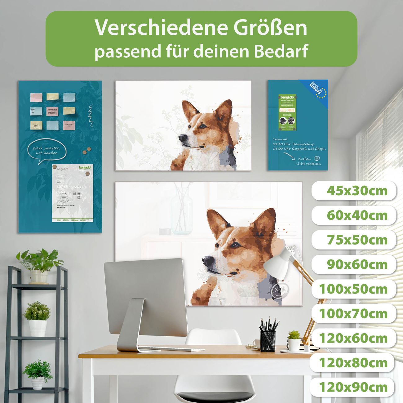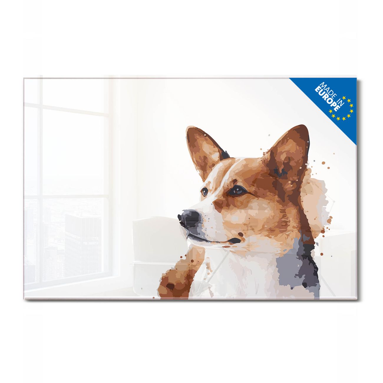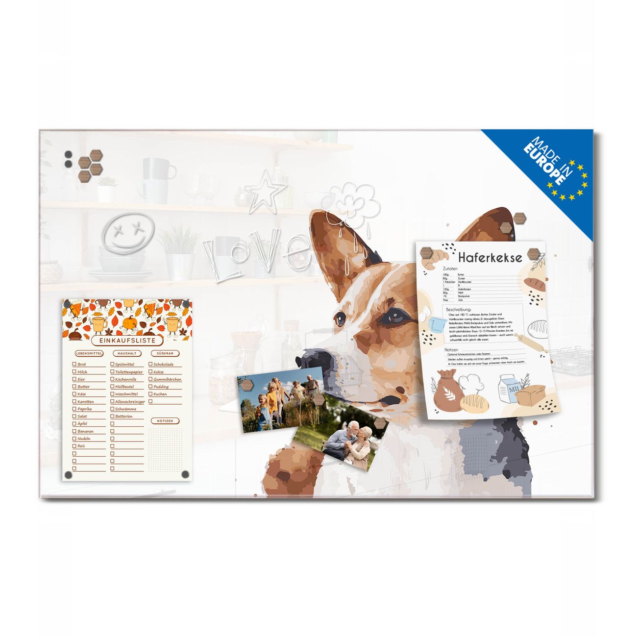 Material: 4mm Sicherheitsglas mit Metallrückwand Eigenschaften: beschreibbar, magnetisch, kratzfest Maße: 75x50x0,6cm, 5,63kg schwer Motiv Nummer 13419 Corgi Porträt Zubehör: inklusive 4 Neodym-Magnete