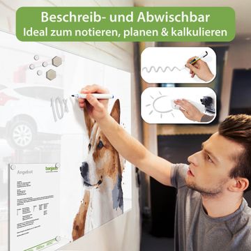 Auf der glatten Glasoberfläche lassen sich Termine, Rezepte oder Notizen ganz einfach mit Kreidestiften festhalten und rückstandslos entfernen. Starke Neodym-Magnete halten Ihre wichtigsten Erinnerungen sicher an Ort und Stelle. So entsteht Ihre ganz persönliche Ideenwand - jeden Tag neu.