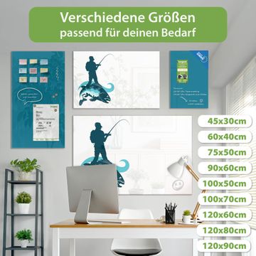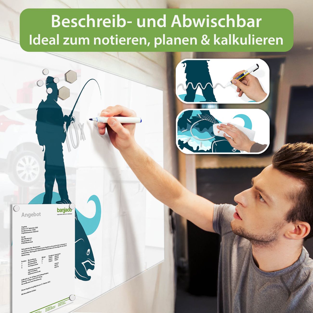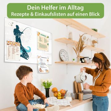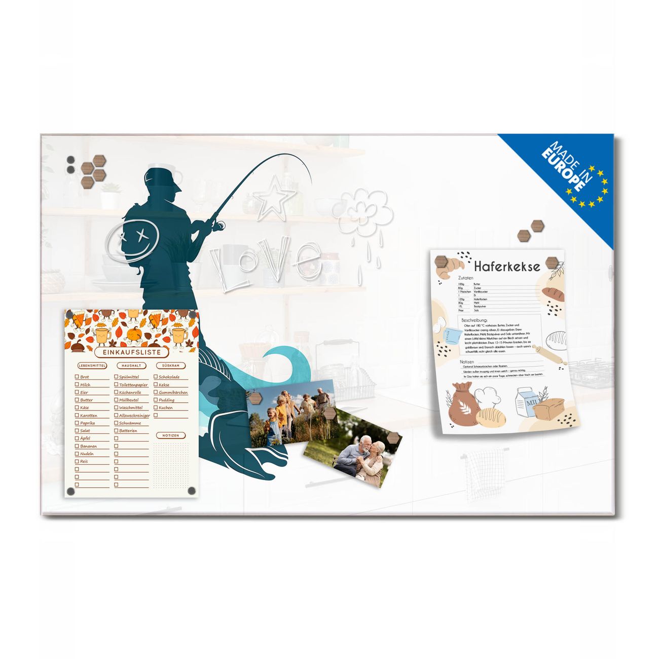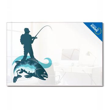 Material: 4mm Sicherheitsglas mit Metallrückwand Eigenschaften: beschreibbar, magnetisch, kratzfest Maße: 75x50x0,6cm, 5,63kg schwer Motiv Nummer 13195 Der Angler Zubehör: inklusive 4 Neodym-Magnete