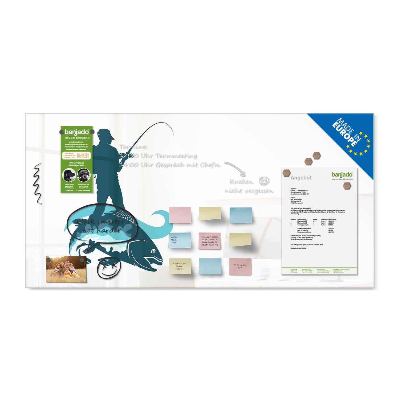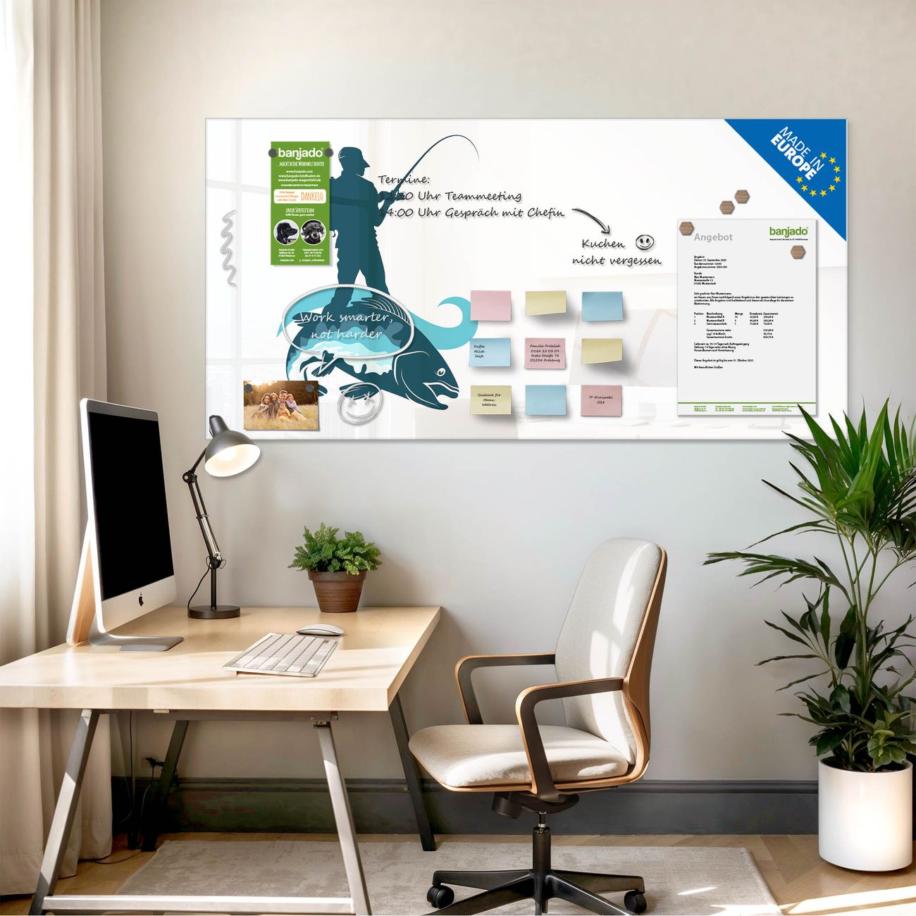 Jede Glas Magnettafel wird in unserer Werkstatt von Hand gefertigt und sorgfältig geprüft. So erhalten Sie ein echtes Qualitätsprodukt, das Funktion und Ästhetik perfekt vereint.?? Warum banjado?